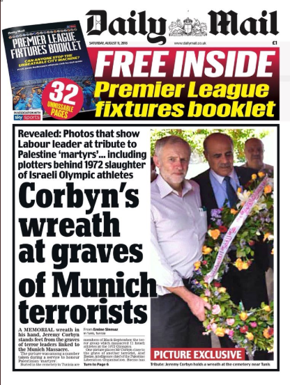 s'est illustré ce samedi 11 août en publiant une Une-choc, titrée : "La couronne de fleurs de Jeremy Corbyn sur la tombe de terroristes de Munich
