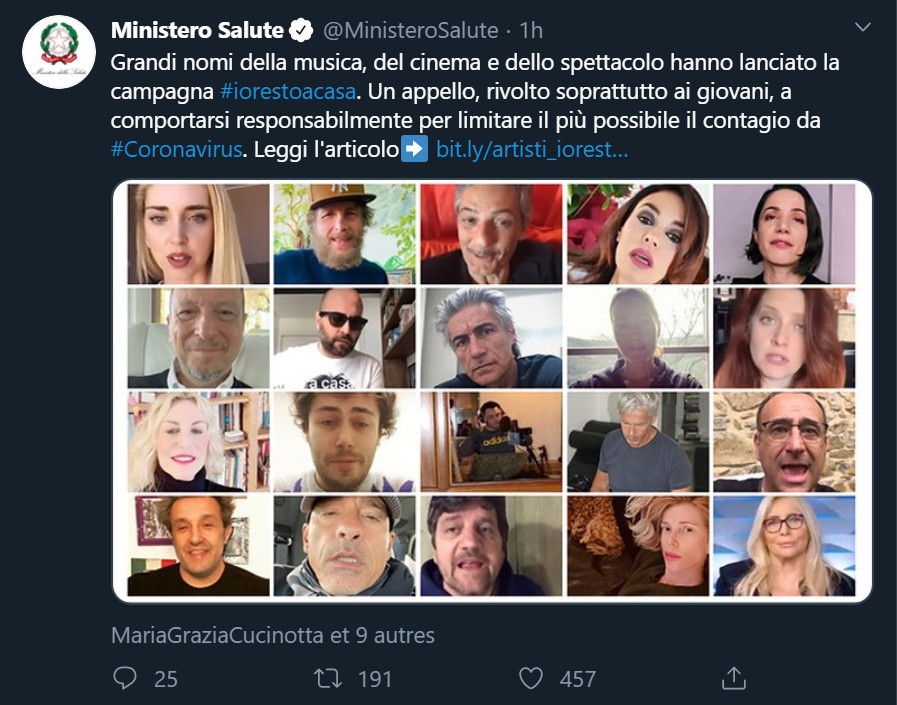 "#jerestechezmoi" : le message, diffusé lundi 9 mars sur les réseaux sociaux italiens par un aréopage d'artistes et de personnalités réquisitionnés par le ministère de la Santé, dit tout de la crise sanitaire que traverse l'Italie, deuxième foyer mondial du coronavirus selon l'OMS avec 7375 cas et 366 morts recensés.