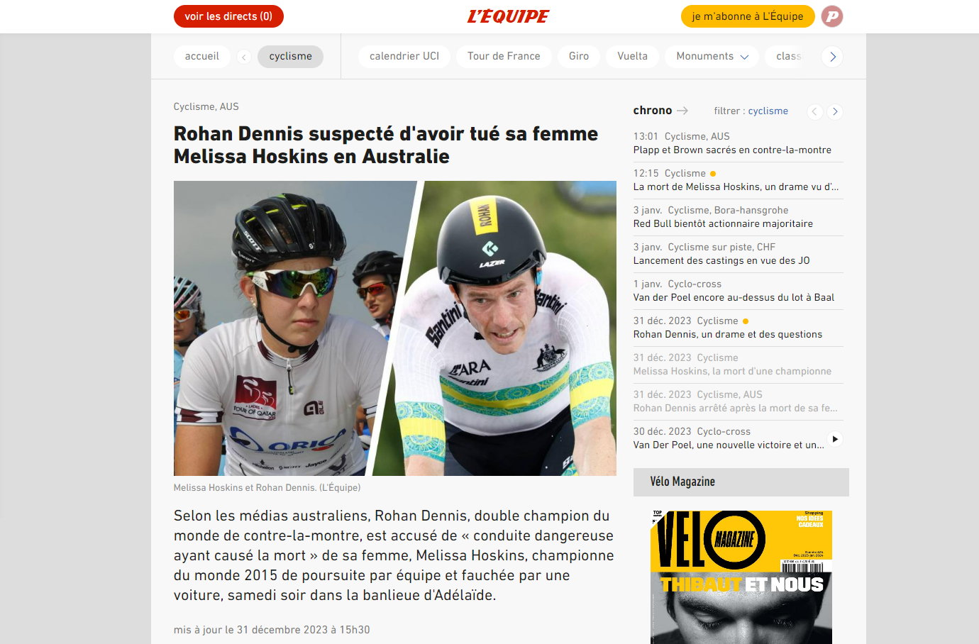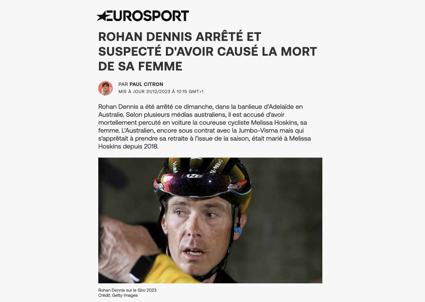 Ces informations étaient pourtant disponibles au moment de la publication. Elles figurent d'ailleurs dans un autre article de l'Équipe, paru... cinq heures avant cette nécrologie de Melissa Hoskins. Le suivant, mis en ligne huit minutes après la nécrologie, n'oublie pas d'ailleurs de préciser que Rohan Dennis était au volant du véhicule et qu'il a été arrêté.