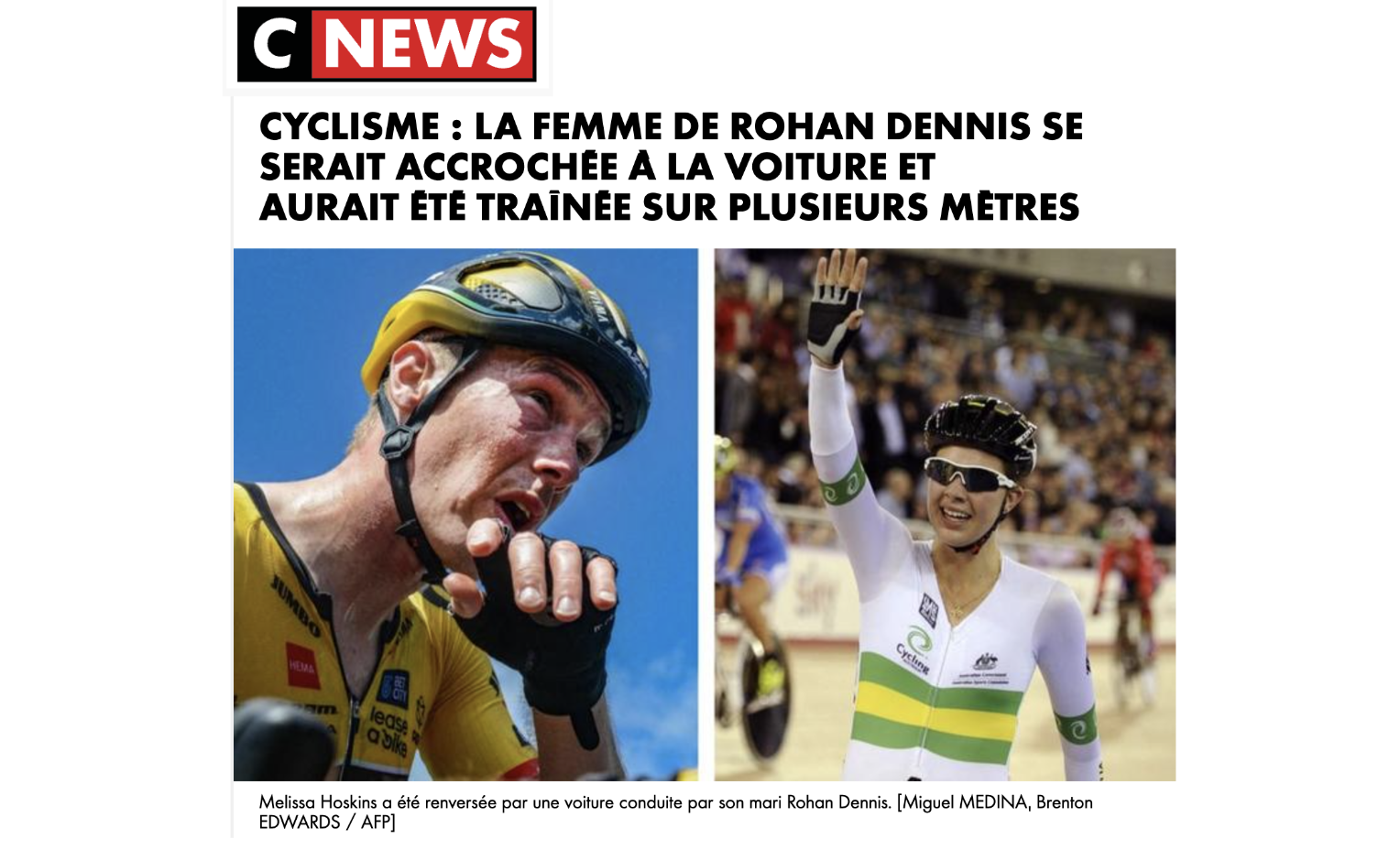 L'Équipe n'est pas le seul média à avoir occulté le rôle de Rohan Dennis. CNews va jusqu'à choisir un vocabulaire qui laisse penser que Melissa Hoskins est quasiment elle-même à l'origine de cette "tragédie", présentée comme un accident. "Cyclisme : la femme de Rohan Dennis se serait accrochée à la voiture et aurait été traînée sur plusieurs mètres", ose titrer la chaîne. Tout le texte semble dédouaner Rohan Dennis : après avoir été "heurtée par le véhicule avec l'ancien coureur australien au volant", Melissa Hoskins "se serait", comme par magie, "retrouvée sur le capot du pick-up de couleur gris (sic) et se serait agrippée à la poignée d'une portière, où ses empreintes digitales auraient été retrouvées", résume la chaîne. "Elle aurait été traînée sur plusieurs mètres avant de finalement lâcher prise." Le Parisien fait de même : "Après s'être accrochée à la portière de la voiture, elle a été traînée sur plusieurs mètres, selon des médias locaux. "