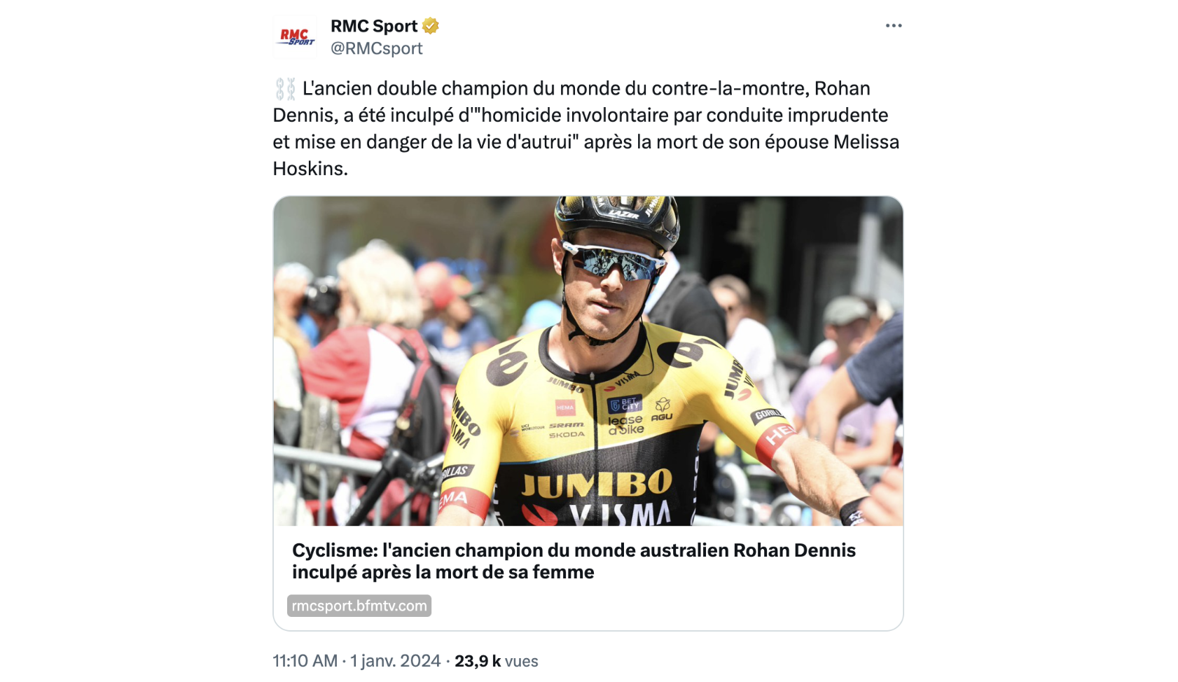 Dans la majorité des autres médias, jamais il n'est indiqué clairement que Rohan Dennis est mis en cause pour avoir "tué" sa femme. Il est "inculpé après la mort de sa femme, Melissa Hoskins, ex-championne également", lit-on dans l'article du Monde tiré de la dépêche AFP. Au Parisien, on apprend que "la jeune femme a été heurtée par un automobiliste" puis, que "son mari, l'ancien champion du monde du contre-la-montre Rohan Dennis, a alors été arrêté puis libéré sous caution." La phrase suivante cite les chefs d'accusation à l'encontre de Rohan Dennis. Pour Eurosport, il est "suspecté d'avoir causé la mort de sa femme". Même expression chez TF1. Sur les réseaux sociaux, RMC Sport met des gants. "L'ancien double champion du monde du contre-la-montre, Rohan Dennis, a été inculpé d'«homicide involontaire par conduite imprudente et mise en danger de la vie d'autrui» après la mort de son épouse Melissa Hoskins", résume la chaîne. L'"ancienne pistarde Melissa Hoskins aurait été traînée sur plusieurs mètres par la voiture de son mari Rohan Dennis", lit-on dans un autre tweet.