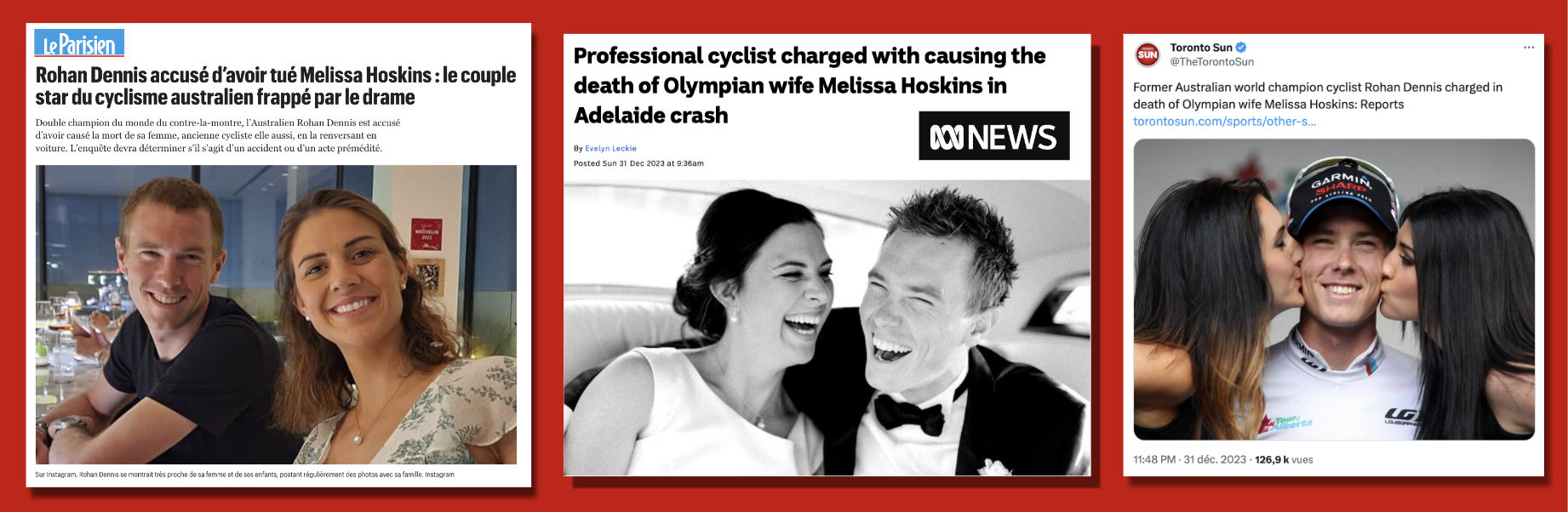 , le Parisien a choisi de montrer les deux protagonistes à travers deux portraits distincts. La légende dit : "Sur Instagram, Rohan Dennis se montrait très proche de sa femme et de ses enfants, postant régulièrement des photos avec sa famille". Dans un autre article, le journal les montre ensemble, tout sourire.