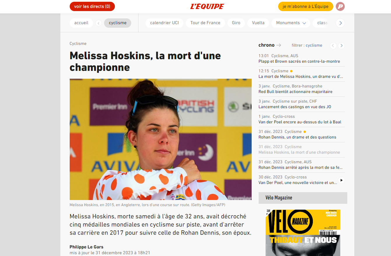 Comme toute nécrologie, l'article est pensé comme un hommage. Melissa Hoskins, originaire de Perth, en Australie, lit-on, était une pointure, quintuple médaillée mondiale en vélo sur piste. Elle a vécu une histoire d'amour, qu'on nous présente comme heureuse, avec une autre star du vélo australienne, plus connue qu'elle : Rohan Dennis. "C'est sa rencontre avec Rohan Dennis qui l'a convaincue de mettre un terme à sa carrière" en 2017, explique le journal. "Ensemble, ils se sont mariés et ont eu deux enfants." Puis, dévouée, elle a suivi son époux au gré de ses entraînements à l'autre bout du monde : "Pendant les courses de son mari, on la voyait souvent en fond de ligne ou aux abords des arrivées pour le soutenir, portant fièrement une belle casquette «Team Dennis»". Elle est morte à 32 ans. De quoi ? On ne le sait pas. Sa dévotion manifeste pour son compagnon et son âge sont les dernières informations de l'article. Le texte ne précise pas que Melissa Hoskins est morte après avoir été percutée puis traînée sur plusieurs centaines de mètres par un véhicule conduit par son mari. Et que Rohan Dennis est donc inculpé pour "homicide involontaire par conduite imprudente et mise en danger de la vie d'autrui". L'auteur de l'article et la direction du service vélo de l'Équipe n'ont pas répondu à nos sollicitations.