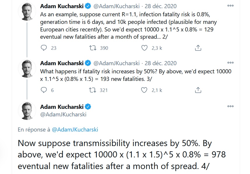 Dès le 28 décembre, le mathématicien et épidémiologiste anglais Adam Kucharski détaille sur Twitter en quoi le risque d'un variant qui causerait une augmentation de 50 % des formes graves est très inférieur à celui d'un variant ayant une transmissibilité supérieure de 50 %. À cause de l'effet cumulatif du second paramètre, il montre, calcul hypothétique à l'appui, qu'il engendrerait cinq fois plus de morts que le premier en un seul mois à population identique. "L'accroissement de quelque chose qui croît exponentiellement (la transmission) peut avoir bien plus d'effet qu'un accroissement identique de quelque chose qui change les conséquences de la maladie (la sévérité des cas)." En clair, mieux vaut un virus qui cause des formes plus graves qu'un virus qui se transmet plus. Jusqu'à présent, presque aucun média de la recension d'ASI, français ou anglo-saxon, n'a su l'expliquer clairement, rappelant l'échec similaire de février et mars 2020, quand la nécessité d'un confinement le plus rapide possible y était débattue. En France, le facteur de reproduction ou "R" était de 0,91 le 26 décembre
