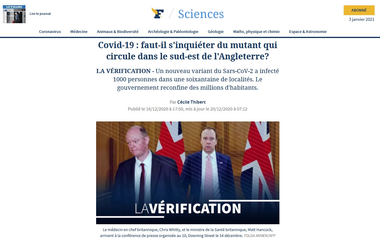 "Au moment où je commence à travailler sur cet article, on dispose encore de très peu d'éléments", explique à ASI la journaliste santé du Figaro Cécile Thibert, autrice de l'article du 16 décembre. Elle signale avoir aussi posé des questions sur la contagiosité au virologue Étienne Simon-Lorière, aussi rassurant que Balloux, le seul cité à ce propos. Et précise qu'un second article portant de manière nettement plus détaillé à propos de la contagiosité a été publié le 21 décembre, au sein duquel d'autres chercheurs cités se montrent encore confiants, "quoiqu'un peu moins que quelques jours plus tôt". Thibert rappelle également qu'il n'y a "pas un mois" sans que des médias ne tirent inutilement la sonnette d'alarme à propos d'une mutation du virus, et son but était donc "d'indiquer qu'il ne fallait pas s'exciter" aux lecteurs du quotidien : "Lorsque j'écris cet article, on avait tellement peu d'informations qu'on ne pouvait être ni trop rassurant, ni trop alarmiste. J'essaie d'être un peu entre les deux, j'ai peut-être été rassurante à tort à posteriori... mais on actualise, je travaille sur le sujet."