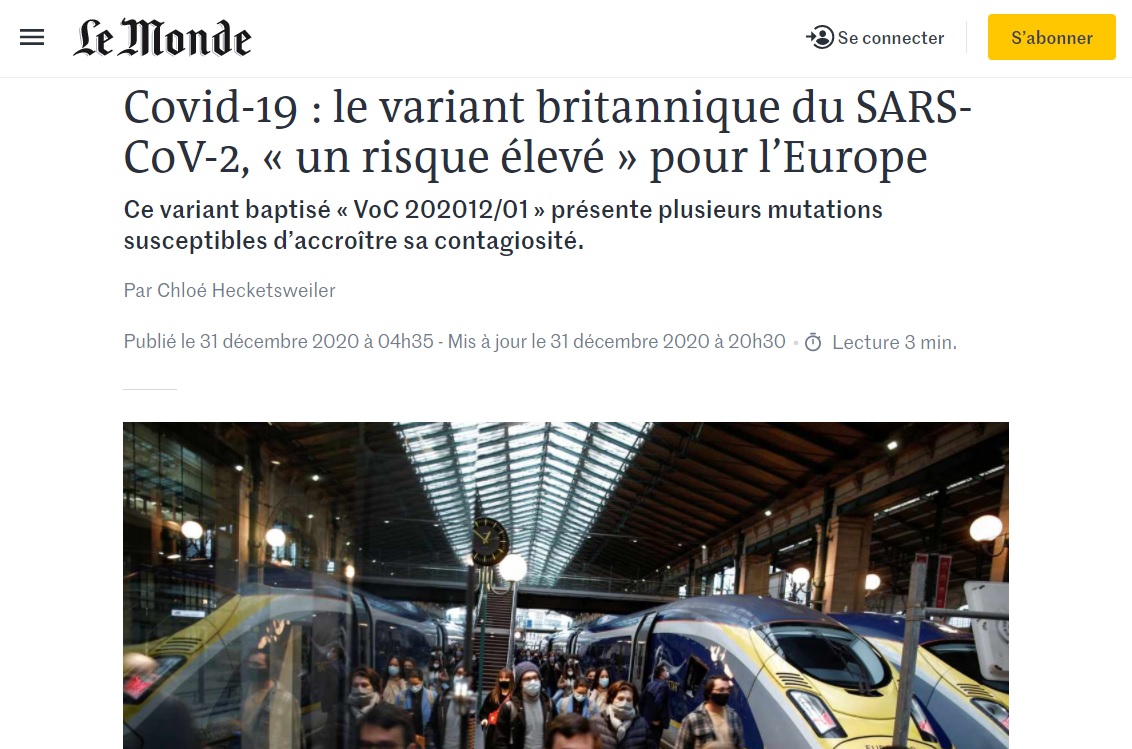 Alors que les confirmations de la forte contagiosité d'un variant du virus, découvert au Royaume-Uni il y a un mois, s'accumulent dans le pays en pleine seconde vague épidémique qu'il domine maintenant, les médias britanniques restent bien mesurés. Le 2 janvier, la BBC titre ainsi, avec retard sur les connaissances scientifiques disponibles, que "le nouveau variant «augmente le taux de reproduction jusqu'à 0,7 point»", et serait "massivement" plus transmissible. Mais il faut attendre le dernier paragraphe pour en découvrir une seule des conséquences concrètes, pourtant dramatiques : "Il va faire augmenter le nombre de malades, mettant encore plus sous pression le service public de santé."
