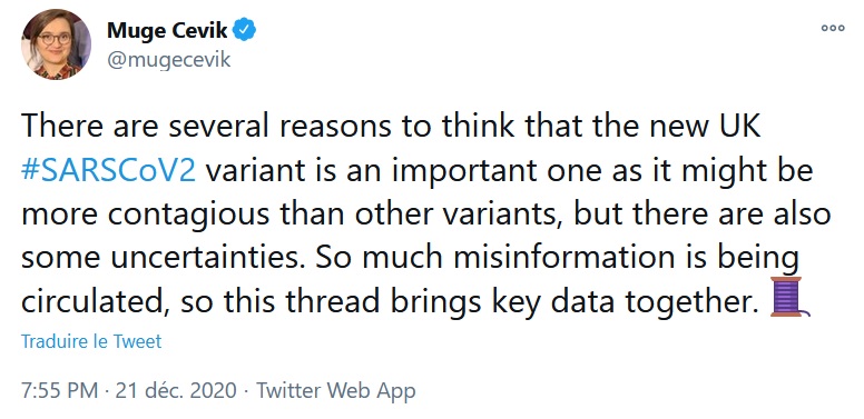infectés]", critique l'épidémiologiste anglaise Deepti Gurdasani, jointe par ASI. Elle aussi s'est fendue de nombreux tweets en guise d'alerte publique, et regrette que les médias anglophones soient jusqu'à présent "incapables d'expliquer que nous verrons exponentiellement plus de morts" avec un variant plus transmissible. "Ceux d'entre nous qui savent ce que cela signifie comprennent que la situation est extrêmement sérieuse, et que nous devrions beaucoup plus agir de manière préemptive à ce stade, mais ce n'est pas répercuté par les médias." Gurdasani déplore également que de nombreux médias n'aient fait appel qu'aux lumières de Balloux, dont elle considère que la prudence l'a plusieurs fois classé ces derniers mois parmi les chercheurs les plus attentistes.