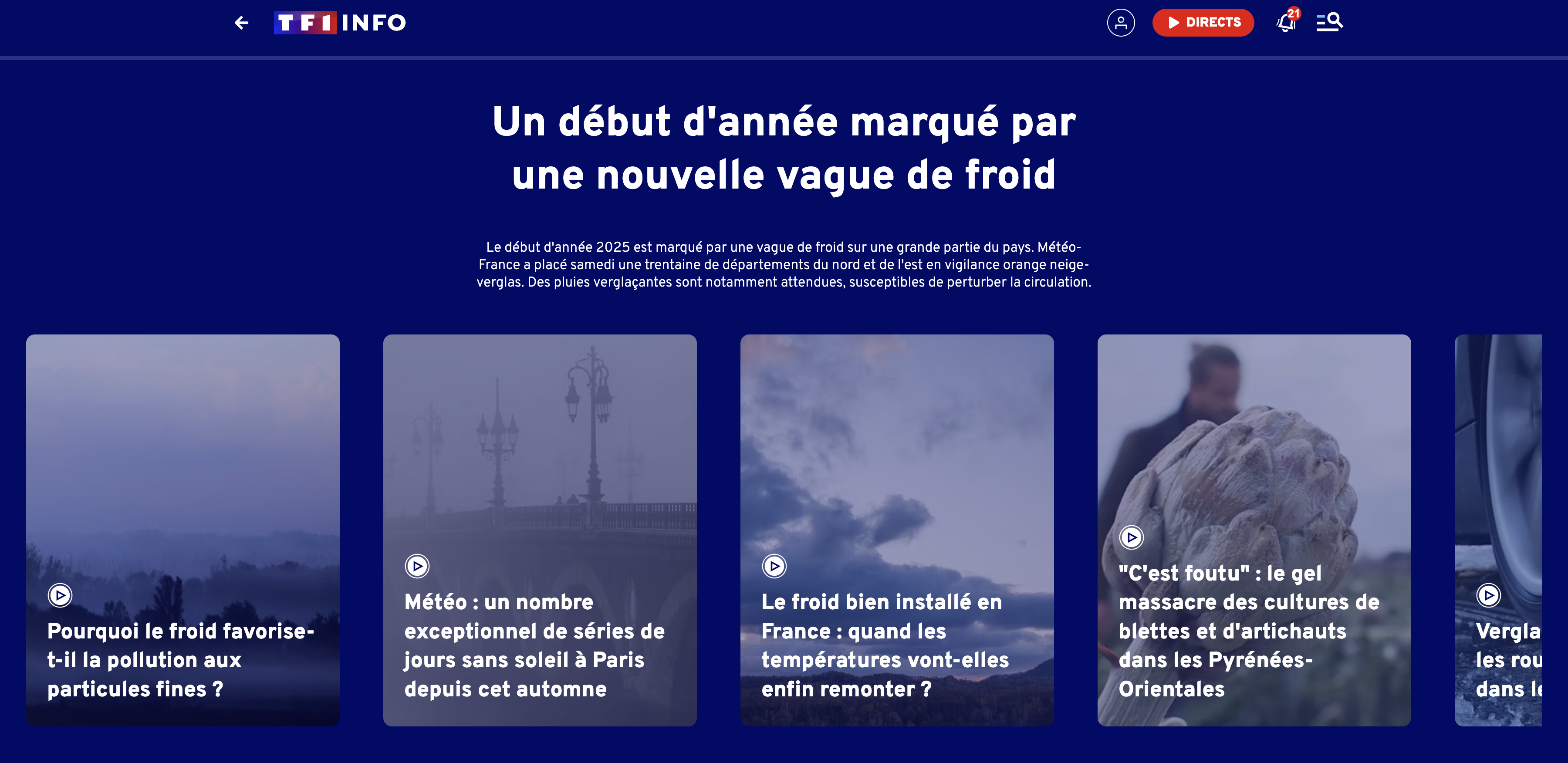 Au 13 heures de TF1, l'hiver est une affaire sérieuse. Le thermomètre et ses saillies vers le bas, observées début janvier dans une partie de l'Hexagone, ont donné lieu à une myriade de sujets. Sur les "carambolages en série" causés par le verglas (11 janvier), "les premiers assauts du froid" (12 janvier), la souffrance des animaux face au froid (12 janvier), la situation face aux températures en Haute-Loire (13 janvier), les "astuces" pour affronter le froid (14 janvier), le verglas (16 janvier) ou encore, la campagne "figée par le froid" (17 janvier). Nous avons vécu "la matinée la plus froide de ces sept dernières années", souligne Marie-Sophie Lacarrau, le 14 janvier. La chaîne n'est pas la seule, ni l'unique média, à avoir largement traité ce pic de froid. Et pour cause.