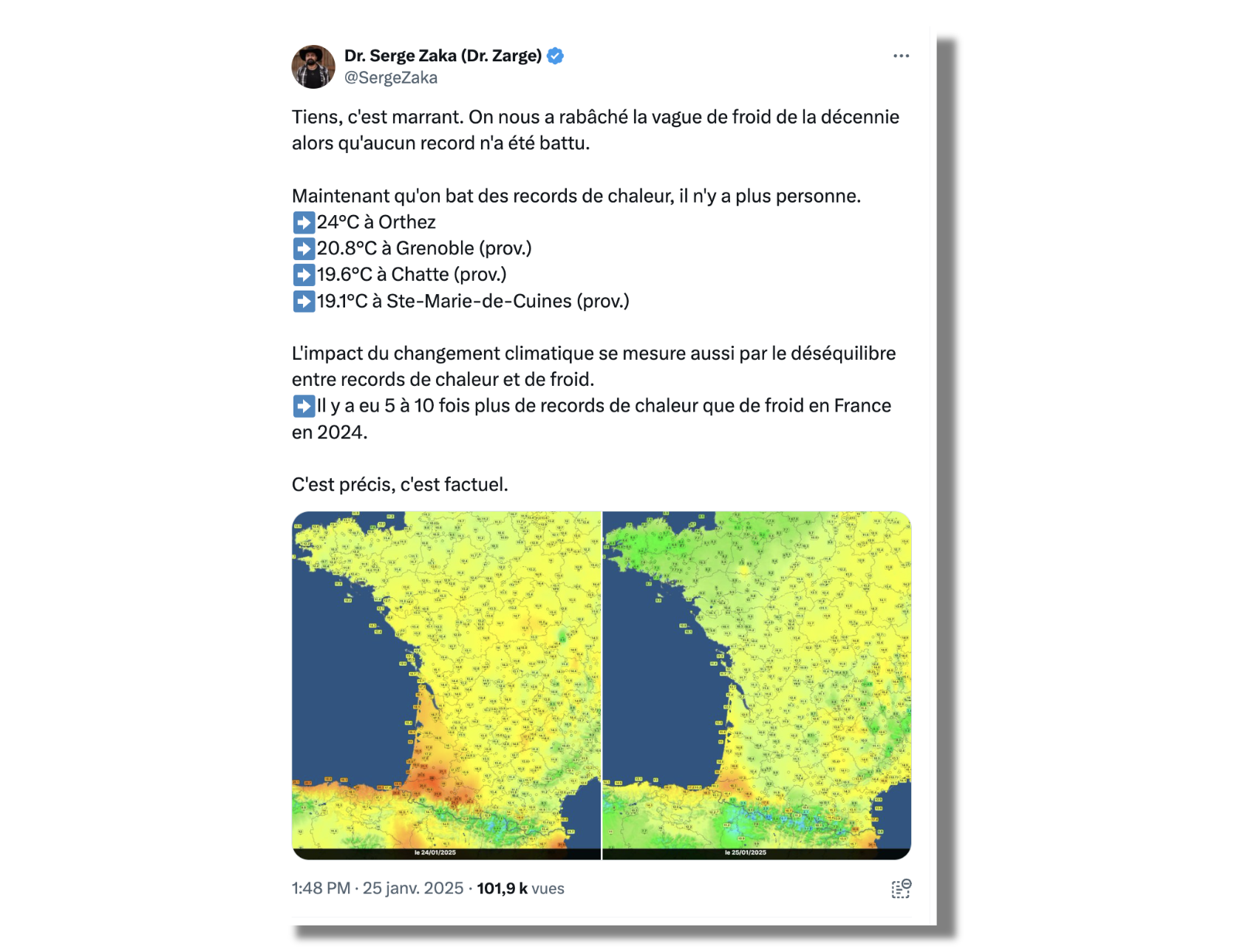 Le constat a indigné l'ingénieur et docteur en agroclimatologie Serge Zaka. "On nous a rabâché la vague de froid de la décennie alors qu'aucun record n'a été battu. Maintenant qu'on bat des records de chaleur, il n'y a plus personne", a-t-il lâché sur BlueSky, carte et chiffres à l'appui. En ce 25 janvier, il a fait "24°C à Orthez, 20.8°C à Grenoble (prov.), 19.6°C à Chatte (prov.), 19.1°C à Ste-Marie-de-Cuines (prov.)", rapporte-t-il. Auprès d'Arrêt sur images, il soutient que "30 records" de chaleur ont été battus dans la journée. Les données proviennent des 2000 stations d'enregistrement du site Info Climat, dont il est vice-président. Pourquoi TF1 n'en a pas parlé ? La chaîne n'a pas répondu à notre demande d'interview ni à nos questions, transmises par mail.