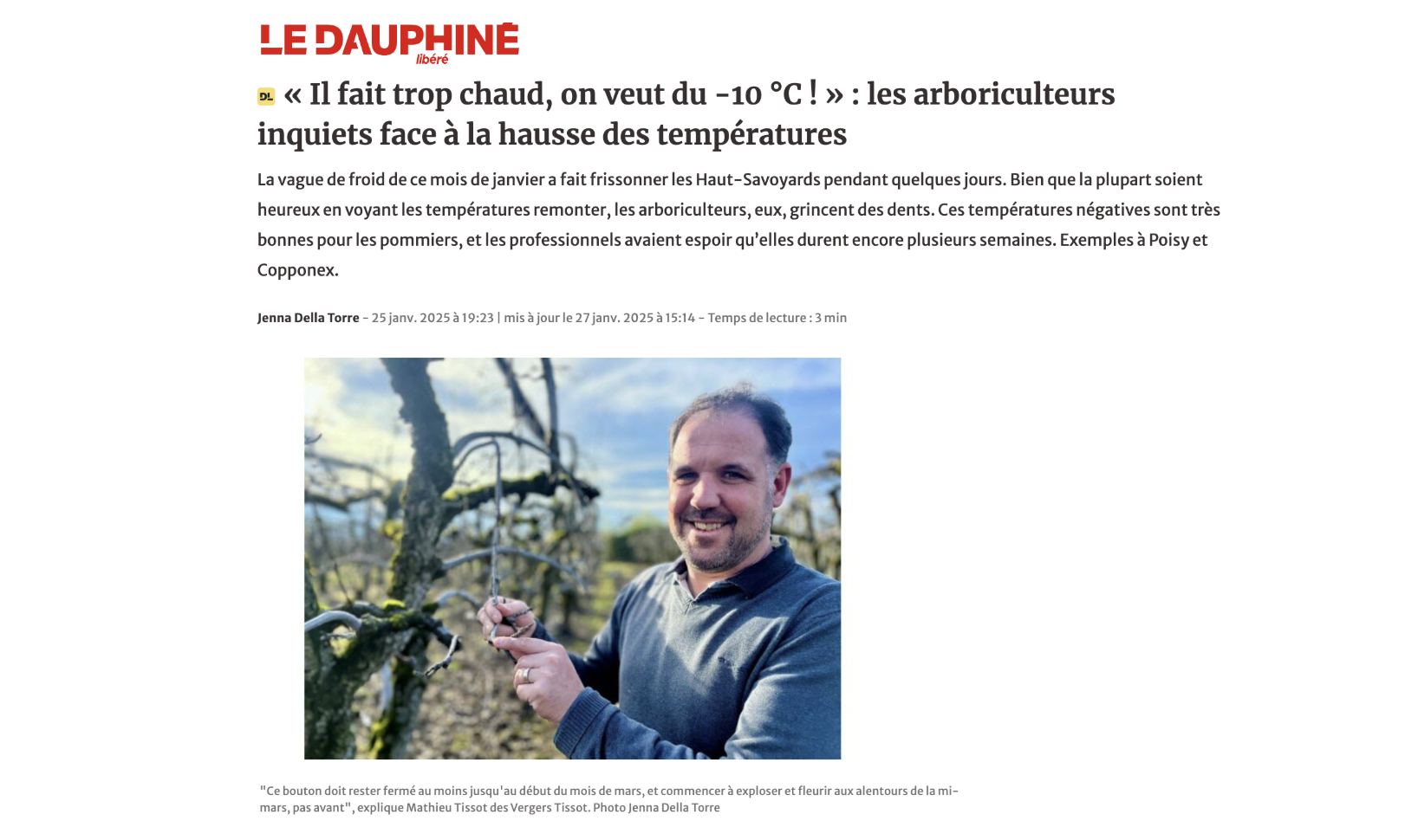 Quid des jours trop chauds ? Une partie des médias a bien traité l'épisode de douceur de fin janvier, comme Actu.fr ou la Provence. "«Il fait trop chaud, on veut du -10°C!» : les arboriculteurs inquiets face à la hausse des températures", a-t-on par exemple pu lire dans le Dauphiné. Libération et le Dauphiné ont aussi noté le record de 27 degrés enregistré dans la ville espagnole de Valence, le 27 janvier. Le même jour, d'autres rédactions ont mis en avant une étude, parue dans la revue Nature Medicine, dont la conclusion alerte sur le réchauffement climatique et les fausses impressions données par les vagues de froid : "la baisse des morts de froid ne compenserait pas celles liées à la chaleur". C'est le cas de Ouest-France. Mais ailleurs : pas grand chose, voire rien, sur les températures élevées.