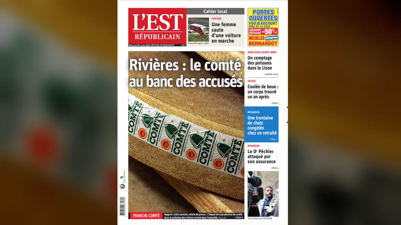 qui a fait parler d'elle dans les chaumières franc-comtoises. Le 26 juillet sur sa page Facebook, puis le 27 juillet sur son site web, Le Monde rapportait les accusations désignant les producteurs du fromage d’Appellation d’Origine Protégée (AOP) le plus vendu de France, le comté, comme responsables principaux de la pollution de bien des rivières de Franche-Comté. L’écho est limité… sauf pour les lecteurs issus des trois départements couverts par l’AOP, qui échangent sur Facebook des commentaires virulents, notamment contre le quotidien. Le 29 juillet, une meule de comté figure à la une du quotidien régional du Doubs, l’Est Républicain. "Le phénomène n’est malheureusement pas nouveau. Et nous l’avons évoqué à de multiples reprises dans nos colonnes", introduit comme pour se défendre le directeur régional Bernard Payot, auteur de l’article, qui laisse une large place aux explications du comité des producteurs – tout en proposant un sondage pour demander aux lecteurs s'ils pensent que les agriculteurs sont vraiment responsables.