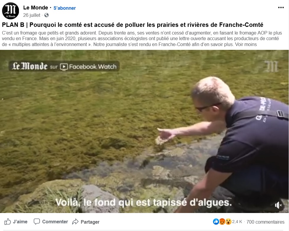 "Les rivières de Franche-Comté ne sont pas en bonne santé", et "même si les causes sont considérées comme 'multifactorielles' (...), le responsable numéro 1 pointé du doigt reste la filière agricole ; en l’occurrence les producteurs de comté qui représentent la principale activité des bassins versants", expose-t-il telle une évidence en reprenant ensuite la plupart des éléments de la vidéo du Monde, de la lettre ouverte des associations de défense de l’environnement à une récente étude scientifique en passant par la croissance très importante de la production de comté. "Dans son reportage publié lundi, le journaliste ne fait rien d’autre que reprendre l’essentiel de cet argumentaire ; sauf que l’impact national lui donne une caisse de résonance autrement plus importante", commente-t-il aussi. Mais qu'ont fait de leur côté l’Est Républicain, son cousin du Jura Le Progrès ou l’hebdomadaire La Voix du Jura ?
