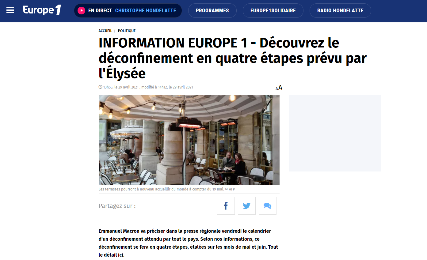 "On se disait bien que ça allait craquer," murmure un localier. "Avec ce genre d'info, il y a toujours un risque de fuite." Tempête dans le verre d'eau des médias : Europe 1 a sorti le calendrier du déconfinement ce 29 avril 2021 à 13h55, coupant l'herbe sous le pied de la presse quotidienne régionale (PQR), qui devait sortir le scoop dans la soirée, à 21h, accompagné d'une interview du président de la République.