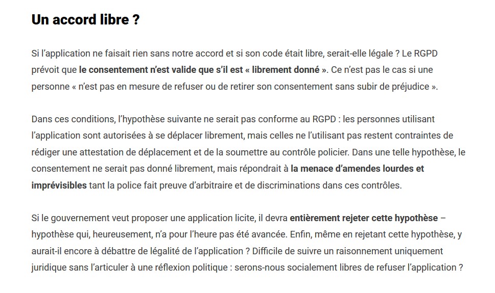 Et là encore, ça ne suffirait peut-être pas. Même si les autorités promulguaient une loi permettant d'imposer le "tracking" à la population, même si l'application était open source, basée sur la technologie Bluetooth et décentralisée (les données personnelles restant stockées sur les téléphones des utilisateurs), un tel système risquerait de contrevenir au Règlement général sur la protection des données (RGPD) européen puisque le consentement ne serait par définition pas "libre", rappelle la Quadrature du Net le 6 avril. Les décrets européens et les lois nationales supportent moins la contorsion que l'opinion publique.