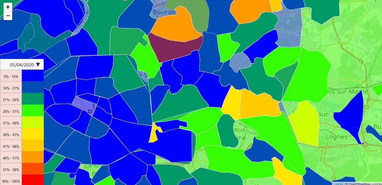 Selon le JDD, ces cartes illustrent "la courbe des déplacements en voiture de l’application Covimoov, qui, entre autres paramètres, calcule un taux de respect du confinement, sur la base de données issues de différentes applications pour smartphones, et par l’application elle-même." Une application de "tracking", comme on dit en ce moment au gouvernement -on préférera le moins glamour et plus concret "pistage"-, introuvable sur les plateformes habituelles (Play Store pour Android, App Store pour iOS). Normal : comme le rappelait le journaliste Olivier Tesquet, Covimoov n'est pas une "application" mais un outil, développé par la start-up française Geo4cast. Sa spécialité : l'analyse de grands volumes de données liées à la mobilité et aux transports, pour visualiser, prédire et optimiser les déplacements. On retrouve sur son site la carte du trafic routier reprise par le JDD, dans une version bien plus précise : en Ile-de-France et autour des grandes agglomérations françaises, la carte interactive de Covimoov descend à l'échelle de la commune.