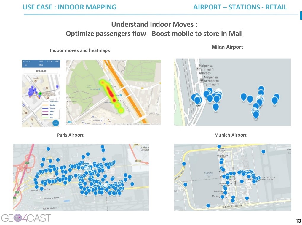 En plus de cette source d'informations personnelles, Geo4cast peut également plonger dans les interfaces de programmation (API) de ses multiples partenaires dans le monde du transport (Air France, SNCF, RATP...) pour affiner ses modèles. Avec l'aide de l'assistant à la conduite Coyote (concurrent de Waze), Geo4cast peut par exemple traquer et visualiser les déplacements de 14 000 appareils pendant plusieurs jours dans la ville de Reims.