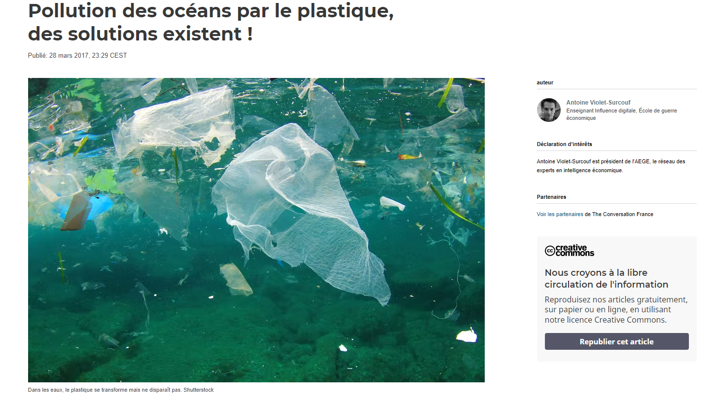 publie ainsi en 2017 l'un de ces faux articles, titré "Pollution des océans par le plastique, des solutions existent !"
