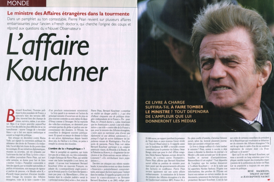 Ce 12 janvier, Marianne reprend des extraits du livre que "Pierre Péan se prépare à publier dans les semaines qui viennent". L'hebdo affirme pour la première fois que Kouchner a réalisé des missions de conseil au Gabon et dans d'autres pays africains, et dénonce le conflit d'intérêt. L'article affirme aussi que Danon a relancé le Gabon alors qu'il était déjà ambassadeur à Monaco, et estime qu'il est "vraisemblable" que le ministre ait demandé un règlement de facture au chef d'Etat gabonais Omar Bongo lors d'un entretien officiel à Paris, le 25 mai.