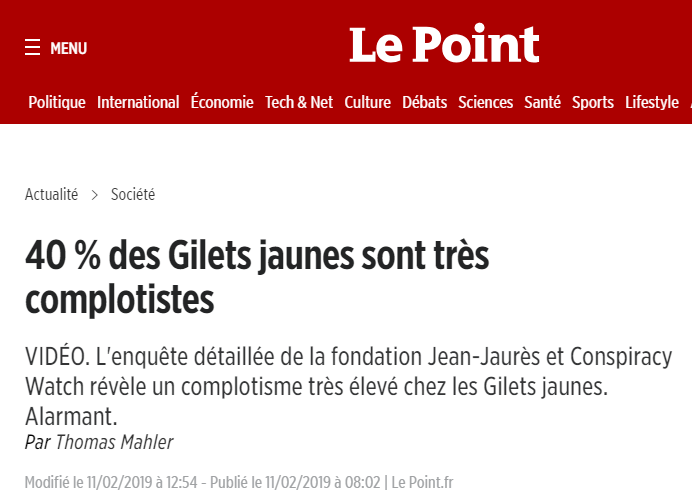 Et de deux ! Comme prévu, lundi 11 février, Conspiracy Watch et la Fondation Jean-Jaurès ont publié la deuxième partie de l'enquête sur le complotisme dans la société française. Avec un angle propre à allécher l'appétit médiatique : "Enquête complotisme 2019 : focus sur le mouvement des « Gilets jaunes »". Et effectivement, les gros titres alarmistes n'ont pas tardé à tomber, comme cet article du Point sobrement intitulé "40% des Gilets jaunes sont très complotistes".