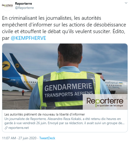 Couvrir une action illégale, pour un journaliste, est-ce se rendre complice de l'action ? Et quand la couverture de l'action nécessite pour le journaliste de pénétrer dans des lieux interdits, doit-il y renoncer ? Vendredi 26 juin, Alexandre-Reza Kokabi, journaliste à Reporterre, était arrêté sur le tarmac de l'aéroport d'Orly. Il suivait des militants écologistes d'Extinction Rebellion, venus dans cette zone interdite au public bloquer le décollage d'un avion, et ainsi dénoncer les aides apportées par l'État au secteur de l'aviation dans le cadre de la crise sanitaire. L'action de désobéissance civile était à la fois dans la veine de ce que fait habituellement XR (Exctinction Rebellion), c'est-à-dire hors-la-loi mais sans violence, et d'une audace inédite.