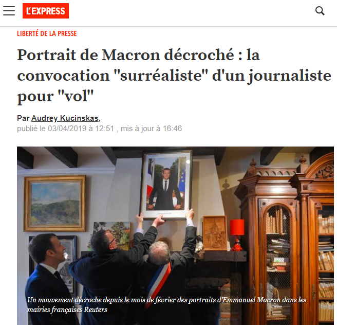 En 2019, une série d'épisodes montrait bien ce basculement. Dans de nombreuses communes de France, des militants écologistes pénètrent dans les mairies et volent les portraits d'Emmanuel Macron pour dénoncer le manque d'action du président concernant l'urgence climatique. La presse, notamment locale, couvre largement ces actions, symboliques mais illégales, représentatives d'une prise de conscience écologique dans l'opinion. Plusieurs journalistes et correspondants de presse, suite à ces actions, ont la surprise de recevoir une convocation de la main des gendarmes. C'est le cas d'un journaliste du Maine Libre et d'un correspondant de Ouest-France, soupçonnés "d’avoir commis ou tenté de commettre l’infraction de vol en réunion", indique Le Monde.