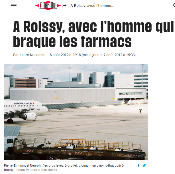 Alexandre-Reza Kokabi n'est pas le premier journaliste à suivre des militants tenter de bloquer des avions sur un tarmac. Ancien salarié de Greenpeace, Pierre-Emmanuel Neurohr a plusieurs fois, dans les années 2010, surgi sur des pistes d'aéroports pour tenter d'empêcher des avions de décoller. En 2012, un photographe de presse indépendant, Martin Leers, le suit sur une action, et capture la scène. Il vend par la suite ses photos à l'AFP. "À ce moment-là, je n'avais pas été placé en garde à vue, tout simplement parce que j'avais quitté le tarmac avant l'arrivée de la police", explique à ASI le spécialiste des questions environnementales, aujourd'hui à la tête du site Le Journal de l'énergie. Le photojournaliste craignait en effet, s'il était arrêté, de voir son travail disparaître avant même d'avoir été diffusé.