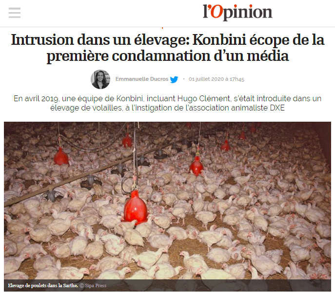 , s'était, en 2019, introduit avec des militants de l'association animaliste DxE France dans un élevage de poulets destinés à être transformés en nuggets pour McDonald's. L'Opinion a révélé le 1er juillet que l'association (depuis devenue Red Pill) et Konbini ont été condamnés à 500 euros d'amende chacun pour "trouble manifestement illicite" par le tribunal de Saint-Malo - pas pour effraction, les portes de l'élevage étant ouvertes. Les images tournées lors de l'intrusion ont dû en outre être retirées d'Internet, sous peine de 5000 euros d'amende par infraction constatée. Konbini s'est plié au jugement en retirant le reportage de son site, tout en faisant appel de la condamnation, indique L'Opinion.