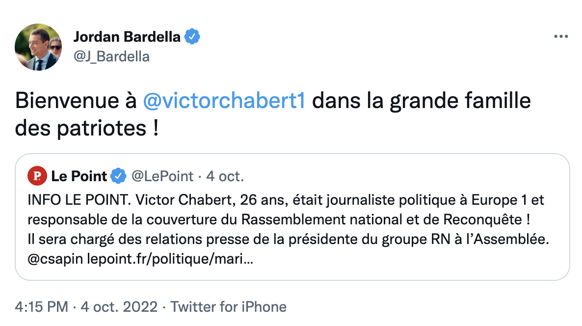Avant, le Rassemblement national recrutait chez le quotidien catholique d'extrême droite Présent, dont vient l'ex-chargée des relations presse de Marine Le Pen devenue députée RN Caroline Parmentier. Maintenant, le parti pioche directement dans les effectifs d'Europe 1, a révélé le Point le 4 octobre : le journaliste Victor Chabert, responsable jusqu'ici de la couverture du Rassemblement national et de Reconquête pour la radio, sera, à partir du 17 octobre, en charge des relations presse de Marine Le Pen, afin de remplacer Parmentier. "Bienvenue à Victor Chabert dans la grande famille des patriotes", se réjouit sur Twitter Jordan Bardella, président par intérim du RN.