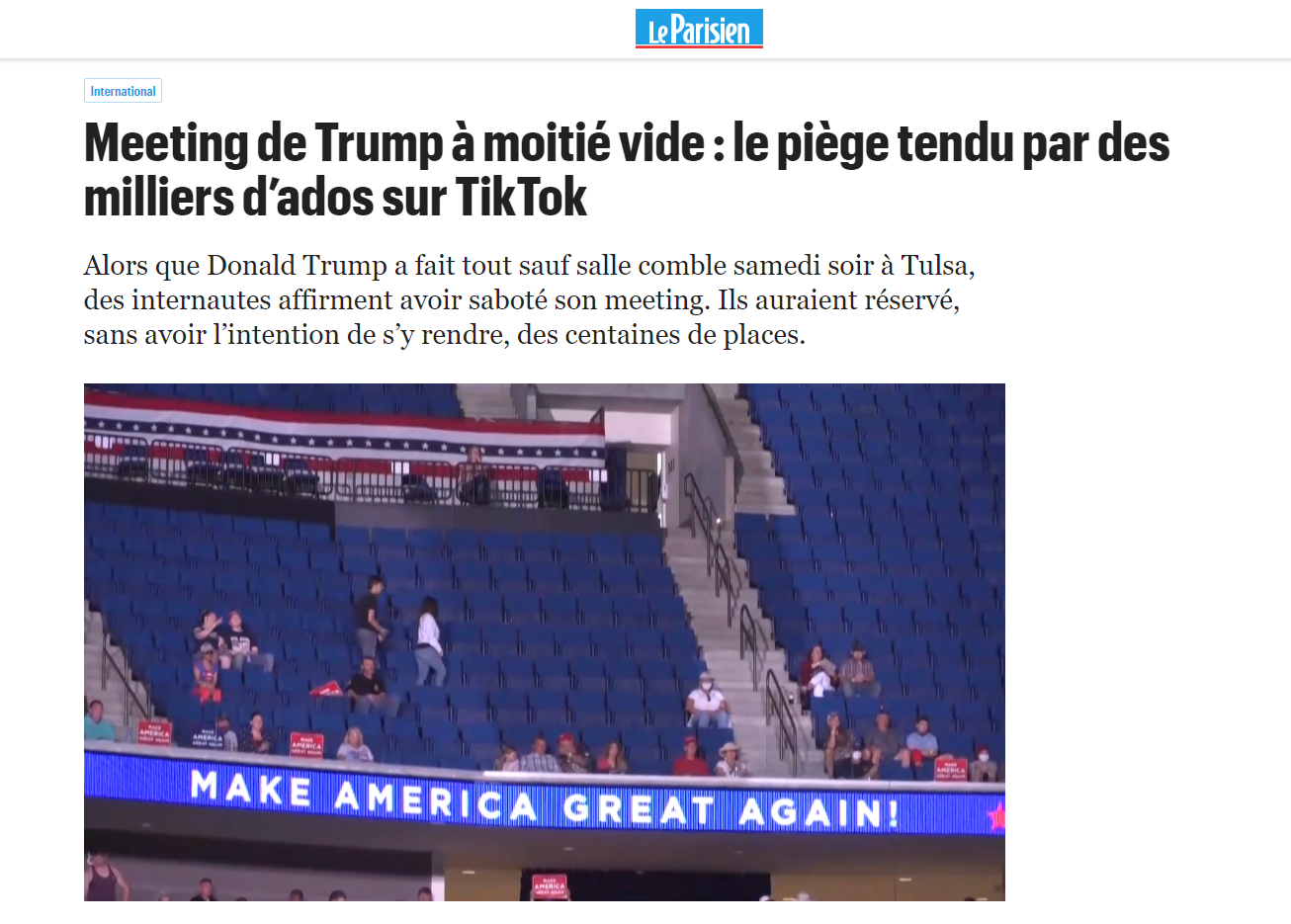 Si plusieurs facteurs - un changement de date au dernier moment, la peur d'un rassemblement de plusieurs milliers de personnes en période de coronavirus - peuvent expliquer la faible affluence du meeting de Tulsa, un différentiel négatif de 993 800 fans reste néanmoins remarquable. Rapidement, une explication alternative émerge : la billetterie en ligne de l'événement, qui, selon les dires des organisateurs, ne prévoyait pas de limite au nombre de billets, aurait été "hackée" par des milliers d'adolescents, sans doute essentiellement américains, réunis sur la plateforme vidéo chinoise TikTok. Ils ont été aidés par la vaste communauté des fans de pop sud-coréenne (la K Pop), surnommés "Stans", très organisée sur Twitter. Leur stratégie : réserver (gratuitement) des dizaines de milliers de billets sur Internet pour faire monter la hype... et laisser les organisateurs se ridiculiser le jour J. Du trolling à grande échelle. Possible? Certainement, car les fans de pop coréenne ont déjà montré à plusieurs reprises leur maîtrise des algorithmes des réseaux sociaux, rappelle Le Monde. Mais impossible à prouver. Ce qui n'empêchera pas la députée démocrate Alexandria Ocasio-Cortez de féliciter, dès le soir du meeting raté, ces adolescents qui la "rendent tellement fière". Ou certains médias français de parler de "piège tendu par des milliers d'ados" et de meeting "saboté".