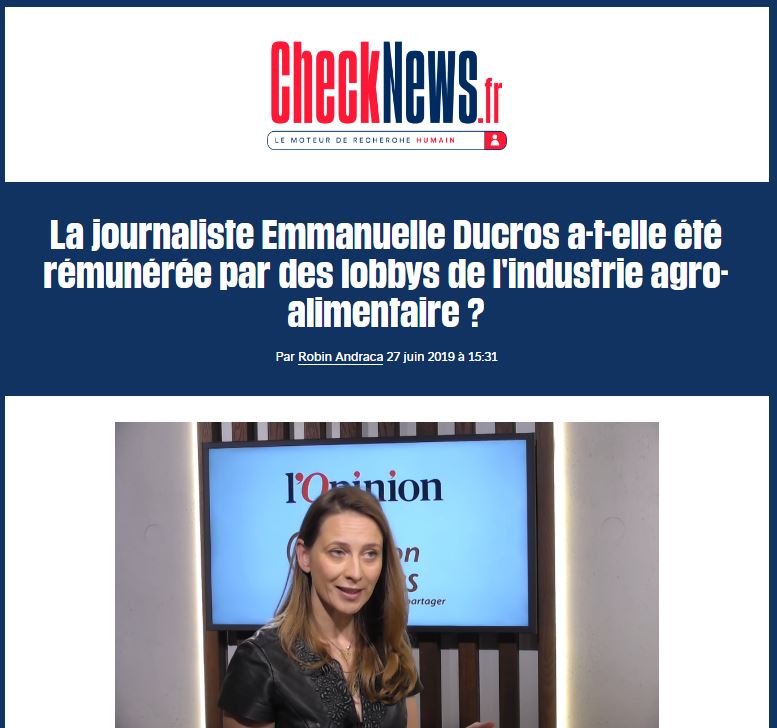 Jusqu’ici, elle avait toujours nié avoir fait des "ménages". Et pourtant, la journaliste Emmanuelle Ducros a bien été rémunérée par un groupe issu du secteur de l’agroalimentaire. C’est ce que démontre ce 27 juin une enquête du service Checknews de Libération qui s’est penché sur les activités de Ducros, lorqu’elle ne couvre pas le secteur agricole pour L’Opinion.