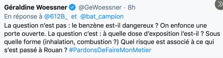 Andreotti avait à l'époque répondu à Woessner sur ce fil Twitter:"C'est évidemment totalement aberrant, témoignant d'une absence totale de compréhension des bases de la chimie, de penser que la combustion puisse être une "forme d'exposition" du benzène. S'il y a combustion… il n'y a plus de benzène."