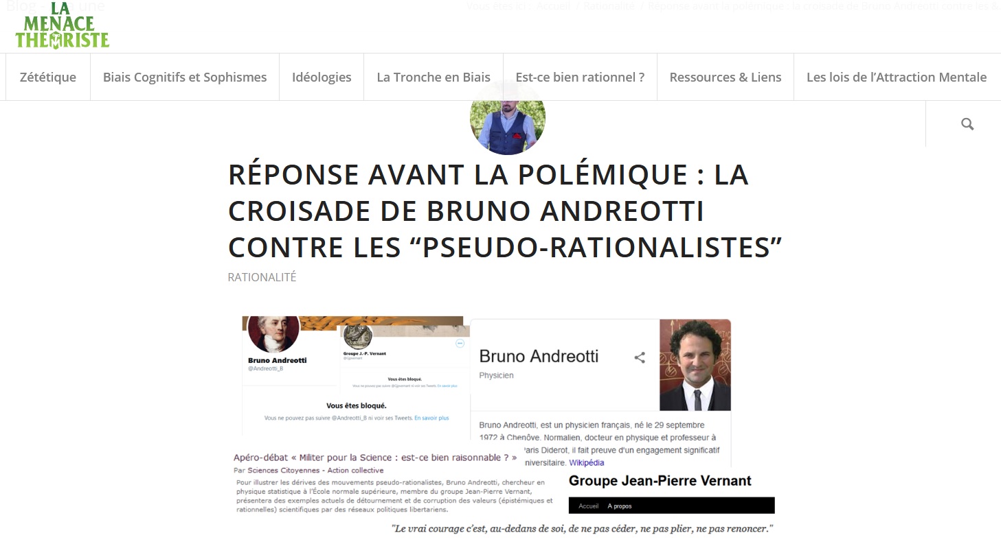 n'a pas dépassé le cercle des spécialistes de la philosophie et de l'histoire des sciences –il a été rendu public le 26 août sur le portail Cairn, après publication de cet article. Intitulé "Contre l'imposture et le pseudo-rationalisme", Andreotti s'en prend avec virulence à ce qu'il désigne comme "un milieu (...) pseudo-rationaliste, mêlant des 'sceptiques', des zététiciens, des vulgarisateurs, des militants 'libertariens', des cadres, des ingénieurs et de jeunes chercheurs", parfois en désaccord entre eux, mais se soutenant mutuellement, notamment sur Twitter, où leur empreinte est importante (la zététique étant "un scepticisme méthodologique appliqué à l’information"
