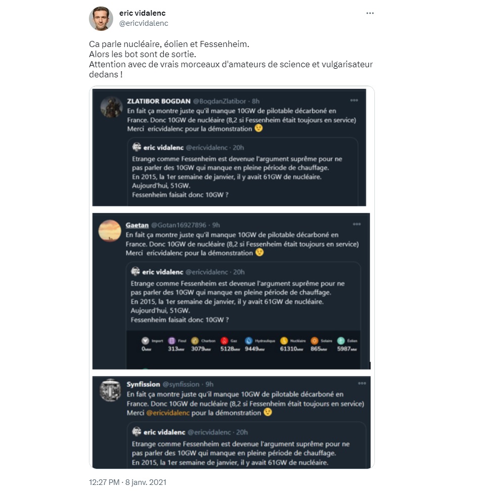 . Plus récemment, le 20 février, Éric Vidalenc faisait remarquer qu'à la suite d'une critique exprimée à son encontre par un pro-nucléaire sur Twitter, une dizaine de comptes automatisés avaient immédiatement "liké" la critique pour la crédibiliser – sans toutefois qu'il ne démontre l'intentionnalité de ces "bots à concours" pour défendre le nucléaire, ce qu'a souligné après publication de cet article le journaliste Vincent Glad d'abord sur Twitter, puis dans Marianne.