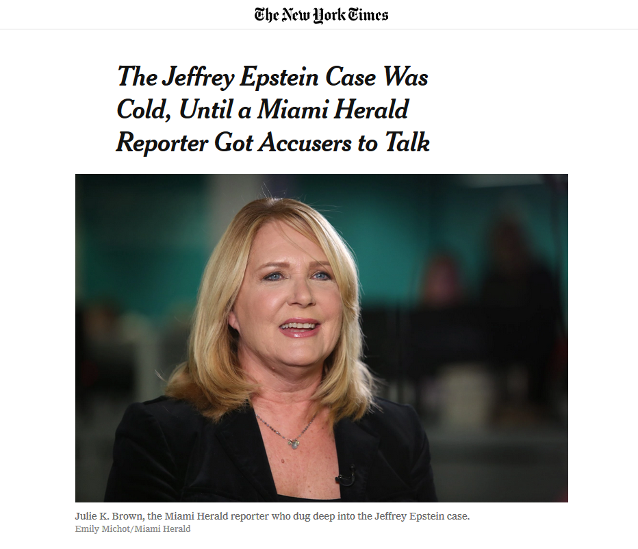 Ce sont ces mois passées à interroger surveillants, policiers, détenus, familles de détenus et organisations de défense des droits de l'homme qui l'ont mise sur la piste d'Epstein, rapporte l'une de ses supérieures du Miami Herald. "C'était le résultat d'une autre enquête, menée par Julie autour des prisons de femmes, et qui l'a conduite à s'intéresser au problème du trafic d'êtres humains. Quand elle a commencé à creuser dans cette voie, le nom de Jeffrey Epstein est revenu encore et encore" racontait le 8 juillet à CNN la rédactrice en chef du Herald, Aminda Marqués Gonzalez.