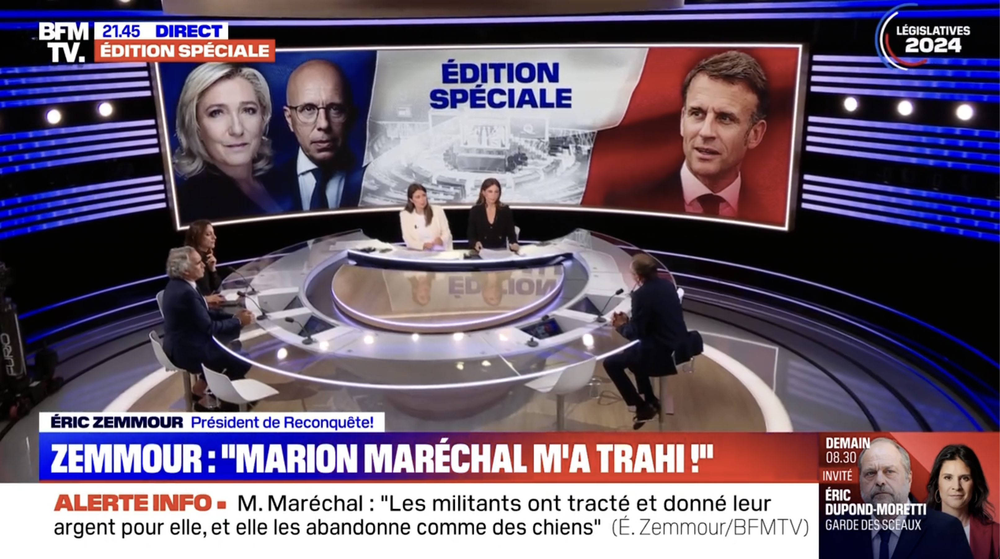 Pour son édition spéciale législatives, La grande recomposition, le 12 juin, BFMTV a invité Éric Zemmour. Le président de Reconquête ! a répondu à un long entretien d'une demi-heure, face à quatre journalistes. Deux présentatrices - Julie Hammett, Alice Darfeuille - et deux éditorialistes - Anna Cabana et Bruno Jeudy. Le générique de l'émission annonce la couleur. Apparaissent Emmanuel Macron, suivi de Marine Le Pen et Éric Ciotti, qui vient d'annoncer un accord entre Les Républicains et le Rassemblement national. Aucun autre visage politique n'apparaît. La même image est diffusée en fond derrière le plateau. La "grande recomposition" ne semble concerner que la majorité et l'extrême droite.