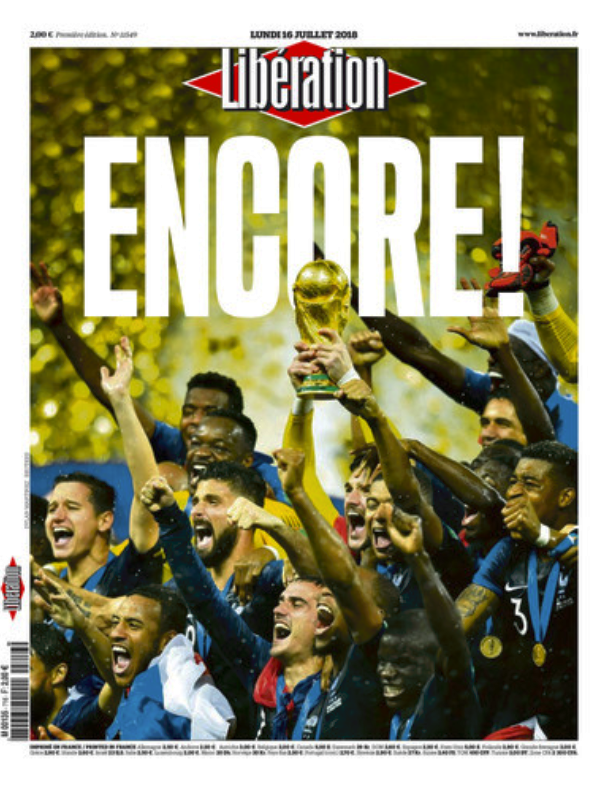 Lundi 16 juillet. Vous vous réveillez (gueule de bois en option) : la France est championne du monde de foot. L'équipe de France s'apprête à défiler sur les Champs- Elysées, on slalome entre les mises en scène, récupérations et coups de com' d'Emmanuel Macron. Les Unes de quotidiens, en ce lundi victorieux, ressemblent plutôt à ça :