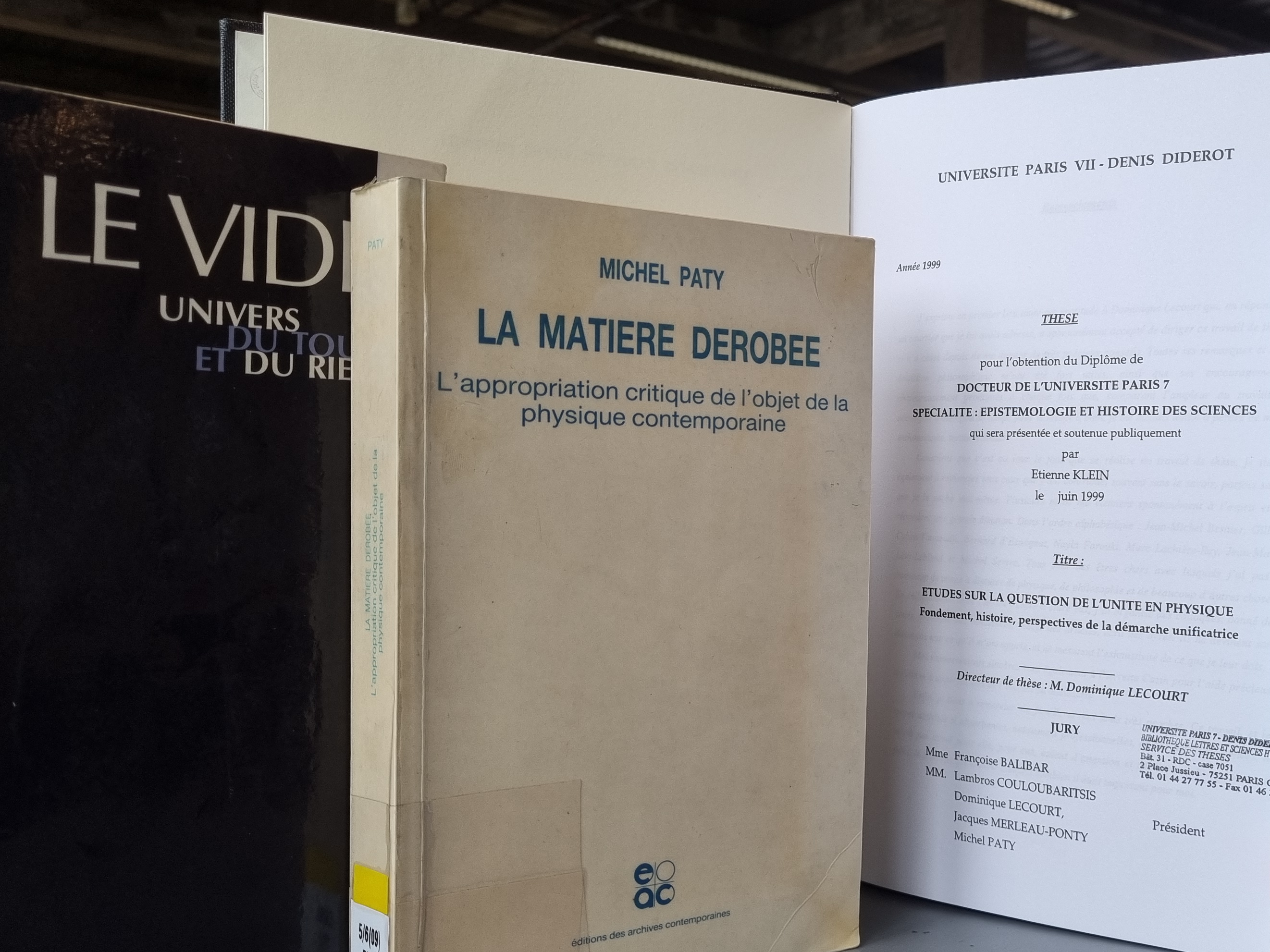 Cette source de la pratique d'Étienne Klein, c'est sa thèse, intitulée Études sur la question de l'unité en physique – ensuite publiée sous le titre L'unité de la physique par Puf. Il l'a soutenue en 1999 à l'Université Paris-Diderot, face à un jury composé de grands noms de la philosophie des sciences tels que Dominique Lecourt, Françoise Balibar, Michel Paty ou Lambros Couloubaritsis. Ils ont validé un travail scientifique pourtant plagié dans les grandes largeurs, puisque notre recension établit que plusieurs dizaines de pages de cette thèse ont été copiées-collées, parfois avec de légères paraphrases, d'autres œuvres d'au moins 22 auteurs et autrices différent·es… y compris trois membres de son propre jury. Au total, nous avons identifié des passages plagiés dans 88 des 429 pages de texte du livre issu de la thèse, soit un peu plus de 20 % : vous pouvez retrouver ici l'intégralité des plagiats identifiés.