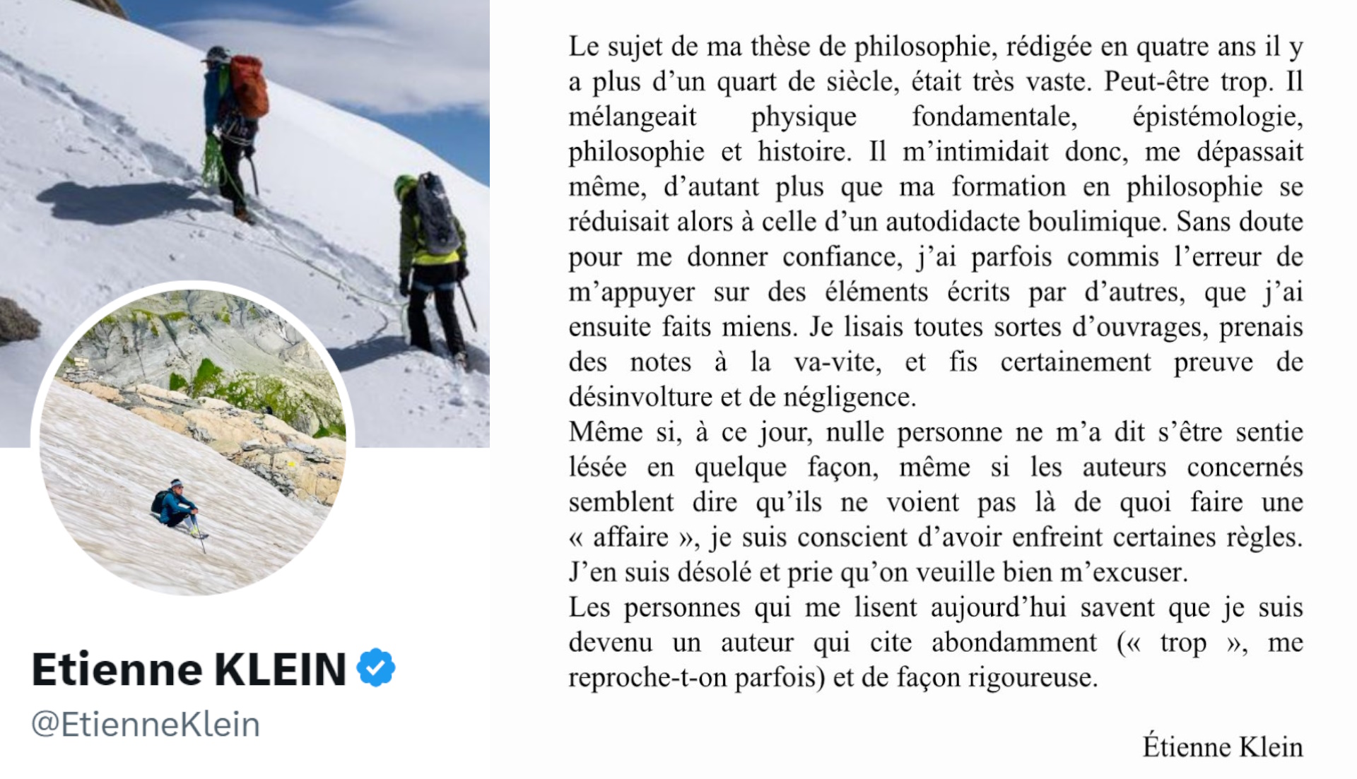 Ces premières pages reflètent les mauvaises habitudes d'Étienne Klein, épinglé en 2016 par l'Express pour des phrases piochées chez de grands auteurs et d'autres physiciens, sujet d'un précédent article d'Arrêt sur images pour le recyclage de ses propres textes… y compris ceux comportant des plagiats déjà identifiés. À l'Express puis au Monde – qui était revenu en 2021 sur les plagiats dévoilés par l'hebdomadaire –, Étienne Klein disait avoir été traversé involontairement par la prose d'écrivains à force de les avoir lus. Ou mettait en avant l'impossibilité de présenter des phénomènes physiques de manière différente du canon scientifique. Auprès d'ASI en mai 2024, il justifiait sa pratique du recyclage de textes afin d'alimenter des ouvrages, chroniques et textes de vulgarisation (plagiats compris) par leur caractère pédagogique. Si l'Express – qui lui avait confié une chronique en 2022 – avait alors cessé sa collaboration avec Étienne Klein, France Culture lui avait conservé sa confiance.