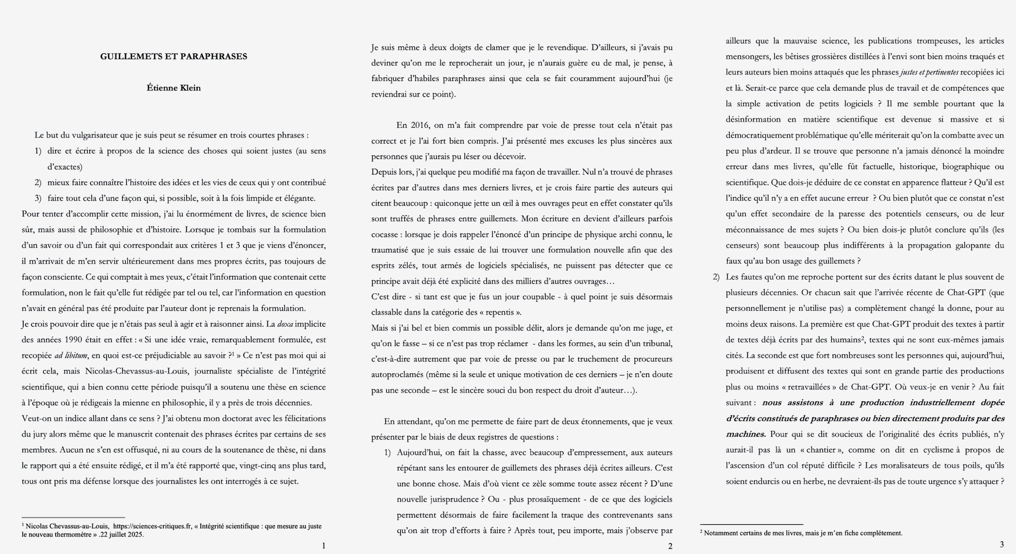 "Mais si j'ai bien commis un possible délit, alors je demande qu'on me juge, et qu'on le fasse – si ce n'est pas trop réclamer – dans les formes, au sein d'un tribunal, c'est-à-dire autrement que par voie de presse ou par le truchement de procureurs autoproclamés (même si la seule et unique motivation de ces derniers – je n'en doute pas une seconde – est le sincère souci du bon respect du droit d'auteur...)", précise aussi Étienne Klein. Le vulgarisateur affirme encore que "la mauvaise science, les publications trompeuses, les articles mensongers" et "les bêtises grossières" seraient "bien moins traqués" et "leurs auteurs bien moins attaqués" que ses plagiats. Et met enfin en avant la "production industriellement dopée d'écrits constitués de paraphrases ou bien directement produits par des machines" avec l'émergence des IA génératives : "Les moralisateurs de tout poil, qu'ils soient endurcis ou en herbe, ne devraient-ils pas de toute urgence s'y attaquer ?"