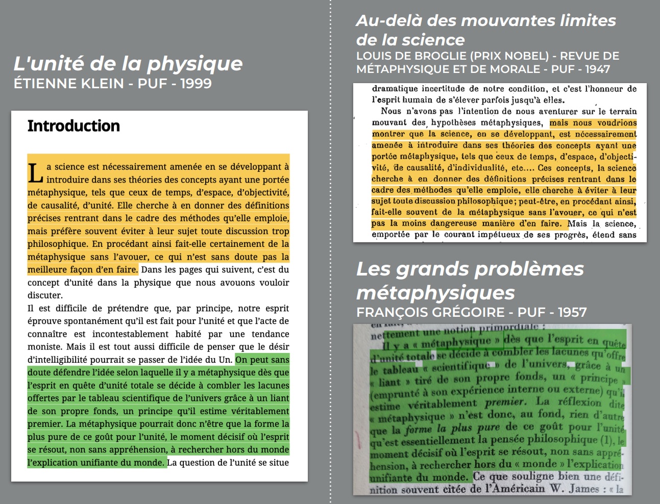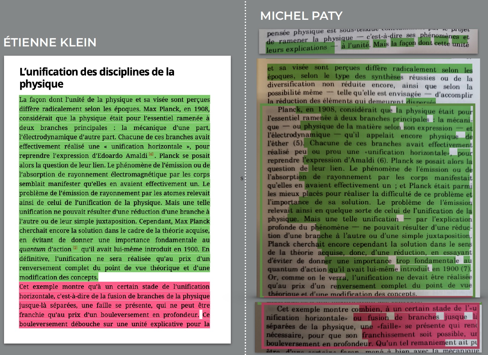 Nous nous sommes également rendus à la bibliothèque universitaire de Paris Diderot, à quelques centaines de mètres de la BNF, où était consultable la thèse originale d'Étienne Klein, pour nous assurer que celle-ci était strictement identique (sources et références comprises) au livre l'ayant republiée. C'est le cas. Lors de ces déplacements, la consultation des ouvrages manquants à notre recension nous a par ailleurs permis d'identifier d'autres plagiats de livres signalés par Google sans pour autant être intégralement consultables. Nous avons ensuite identifié plus précisément l'ampleur de chaque plagiat grâce à un outil en ligne de comparaison automatique de textes hébergé sur le site de l'Université internationale des sciences appliquées de Berlin. On ne parle pas ici de citations usuelles courantes dans le monde de la recherche et balisées comme telles, via notamment l'usage des guillemets.