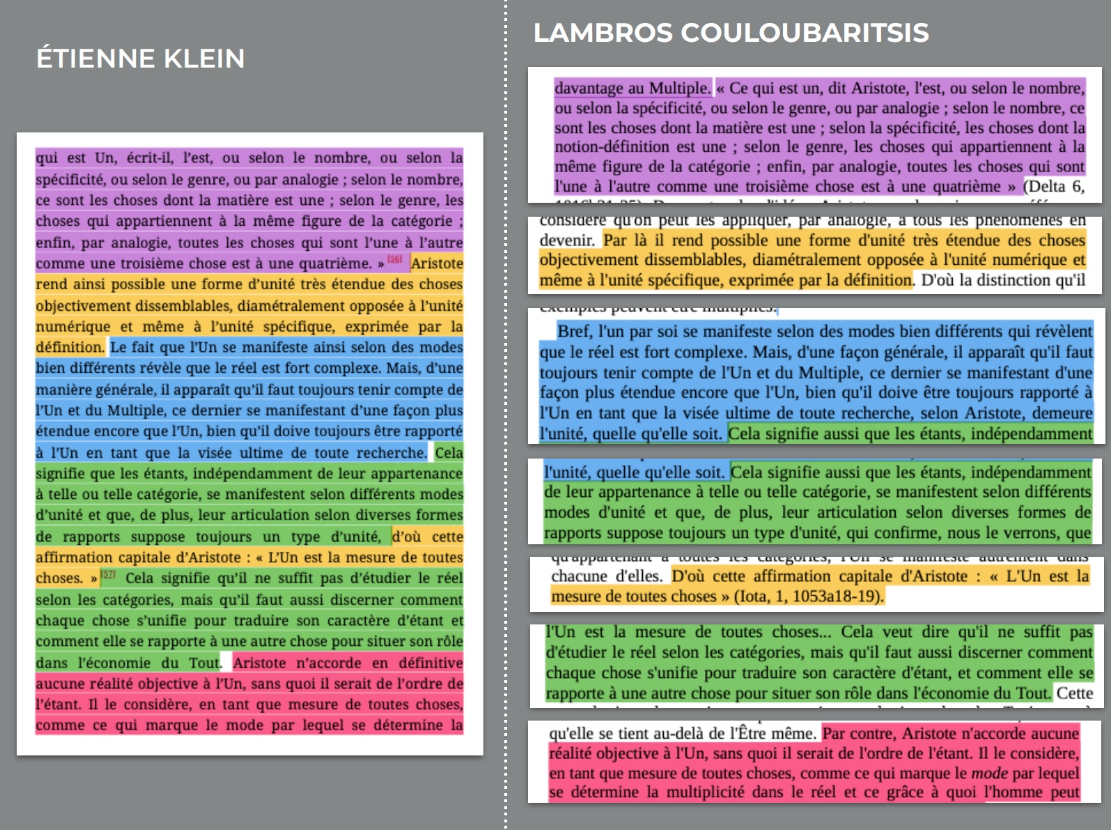 Qui sont les victimes de ces plagiats ? Étienne Klein emprunte en général aux meilleurs, tels que les prix Nobel Louis de Broglie ou Albert Camus, déjà cités. Lorsqu'il s'agit de décrire les philosophies d'Aristote ou de Thomas d'Aquin, Étienne Klein pioche dans l'Encyclopædia Universalis, encyclopédie de référence avant la naissance de Wikipedia, composée d'articles écrits par des spécialistes de chacun des sujets traités. Lorsque Klein décrit Le Traité du Ciel d'Aristote, il le fait ainsi avec les mots de Pierre Aubenque, spécialiste du philosophe antique. Nulle part dans sa thèse ne sont pourtant citées ces notices d'Aubenque, ou celles écrites par Marie-Dominique Chenu et Jean Trouillard, dont il a aussi copié des passages. Il n'évoque pas plus les Que sais-je