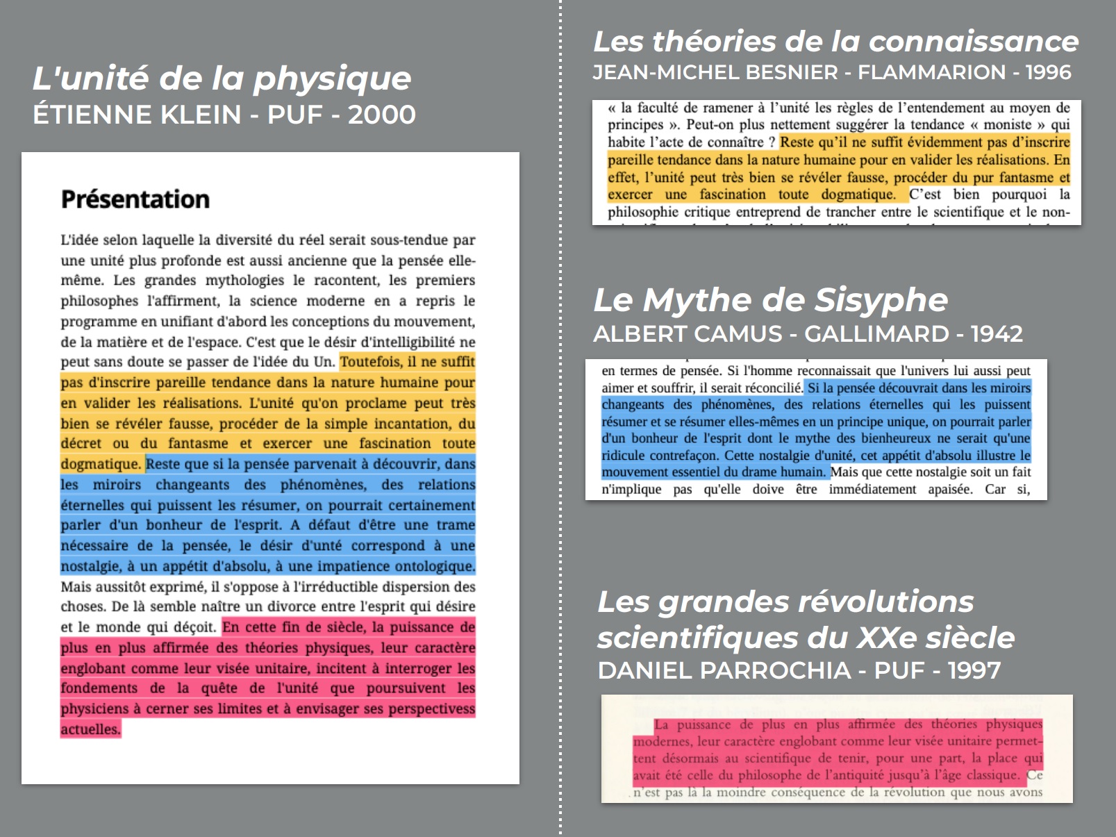 "Si la pensée parvenait à découvrir, dans les miroirs changeants des phénomènes, des relations éternelles qui puissent les résumer, on pourrait certainement parler d'un bonheur de l'esprit. À défaut d'être une trame nécessaire de la pensée, le désir d'unité correspond à une nostalgie, à un appétit d'absolu, à une impatience ontologique." Ces deux (belles) phrases proviennent de la première page de L'unité de la physique (Puf, 2000), republication au mot près de la thèse en philosophie des sciences d'Étienne Klein, soutenue en 1999. Elles sont surtout copiées-collées du Mythe de Sisyphe (Gallimard, 1942) d'Albert Camus. Cette même première page contient ensuite quatre phrases recopiées à partir d'ouvrages des philosophes des sciences Jean-Michel Besnier et Daniel Parrochia.