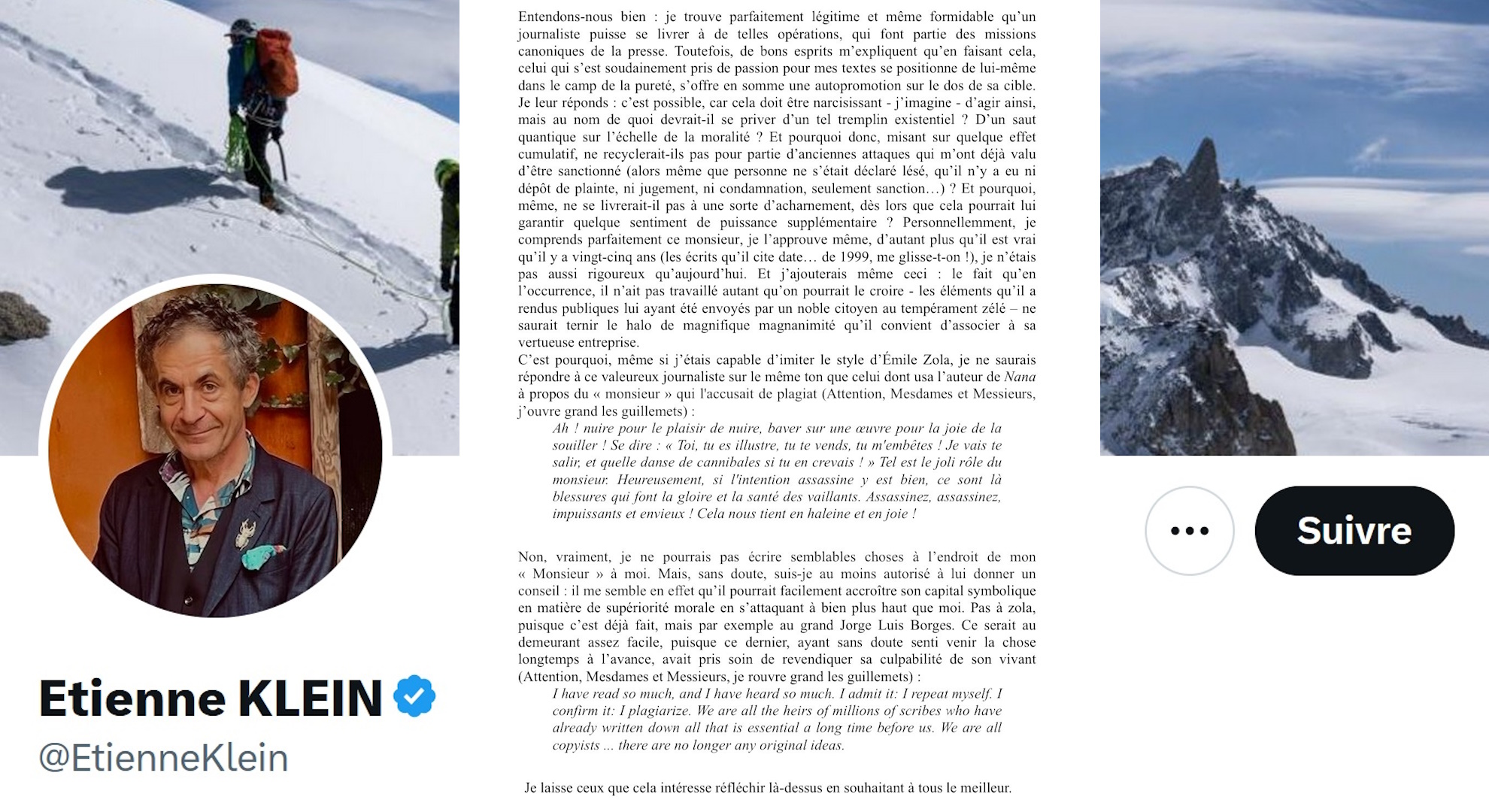 Quelques heures après publication de cet article, Étienne Klein a posté sur X une longue réponse – ensuite supprimée, nous la republions ci-dessous. Après un long développement sur "une sorte d'acharnement" dont il serait l'objet de la part de Loris Guémart (coauteur de ces lignes), Klein écrit : "Il est vrai qu'il y a 25 ans (les écrits qu'il cite datent... de 1999, me glisse-t-on !), je n'étais pas aussi rigoureux qu'aujourd'hui." Il ne précise pas que "les écrits" concernés sont ceux de sa thèse de doctorat. Étienne Klein précise aussi que je n'aurais "pas travaillé autant qu'on pourrait le croire" car "les éléments qu'il a rendus publics lui ayant été envoyés par un noble citoyen au tempérament zélé". Cette affirmation ne semble pouvoir désigner que le coauteur de cet article, le journaliste Jean Abbiateci. Enfin, Klein se compare à Zola et Borges en les citant en italique.