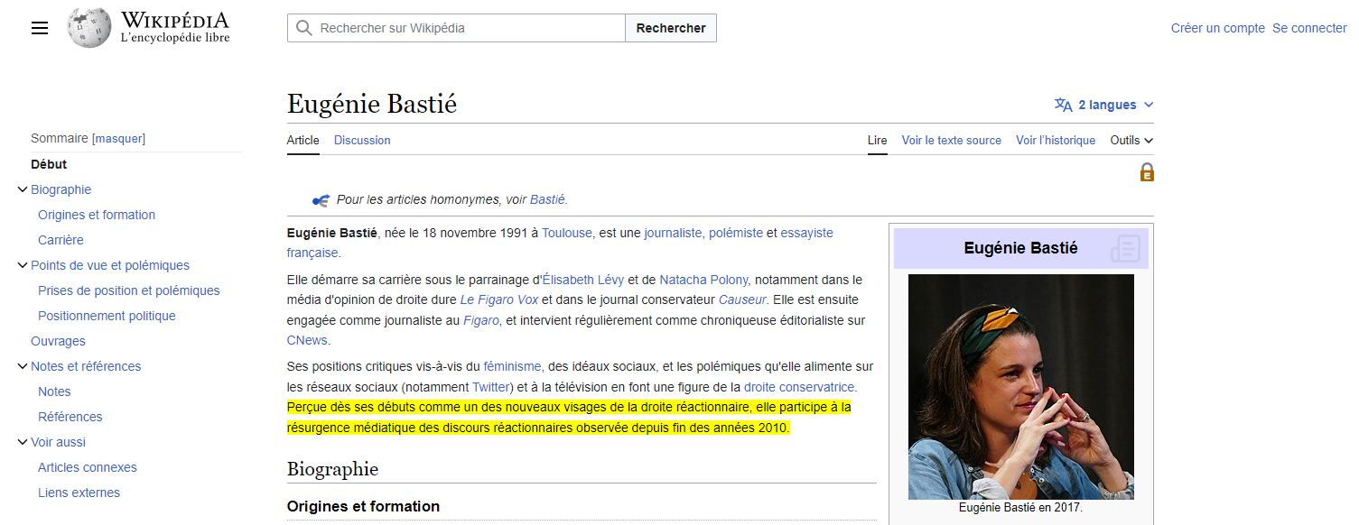 L'article précise dans la rubrique "Positionnement politique" que si Bastié n'est pas "ouvertement affiliée à un parti politique, son parcours et ses prises de position sont jugés