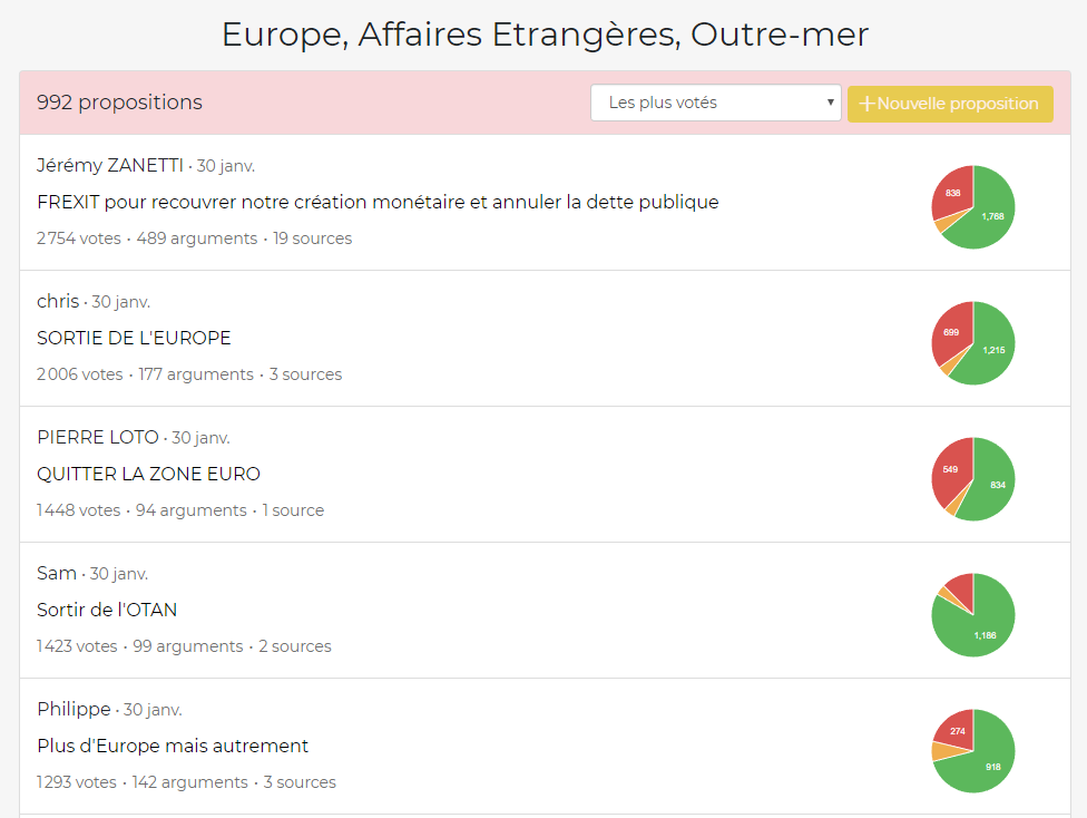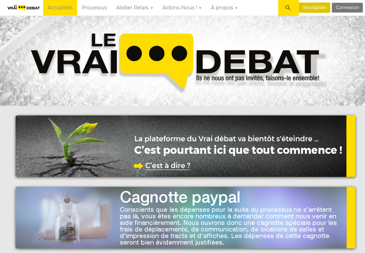 sur les arguments des autres, etc. Ni l'un ni l'autre ne sont en fait des "débats", puisque même dans le Vrai débat, les arguments ne se répondent pas forcément les uns les autres. Nous sommes plutôt face à un sondage dans le cas du Grand débat, et une consultation dans celui du Vrai débat. Dans le premier cas, il s'agit pour le gouvernement de clore le débat, alors que dans le second, les organisateurs voient la consultation en ligne comme une étape, une plateforme pour faire ressortir des propositions qui seront ensuite débattues lors d'assemblées.