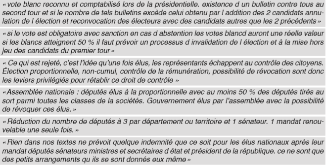 Pascal Marchand : - Les personnes qui ont répondu au Vrai débat ne sont pas dans une optique de cahier de doléances, mais ils veulent créer un rapport de négociations avec le gouvernement. Ils ne disent pas "on veut tout casser", ils estiment que les bases du "système" ne sont pas forcément mauvaises, mais qu'il est gangrené, qu'il faut l'assainir. Ils ne veulent plus de politiciens qui trahissent leurs promesses, ils ne veulent plus voter utile, ils veulent reprendre en main la politique, pour reprendre confiance dans le système.