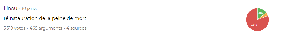 Pascal Marchand : - A un moment donné, nous avons noté un afflux massif d'opinions pour la peine de mort, dans un temps très court, ce qui pourrait laisser penser à une opération coordonnée. Les participants ont vu arriver un flot de questions sur le thème, et ils ont massivement voté contre. Mais attention, on ne sait pas qui sont les contributeurs. Il ne s'agit pas d'une enquête sociologique. On ne peut donc pas monter en généralité, et attribuer les opinions exprimées à l'ensemble des Gilets jaunes, ni, à fortiori, à l'ensemble des Français.