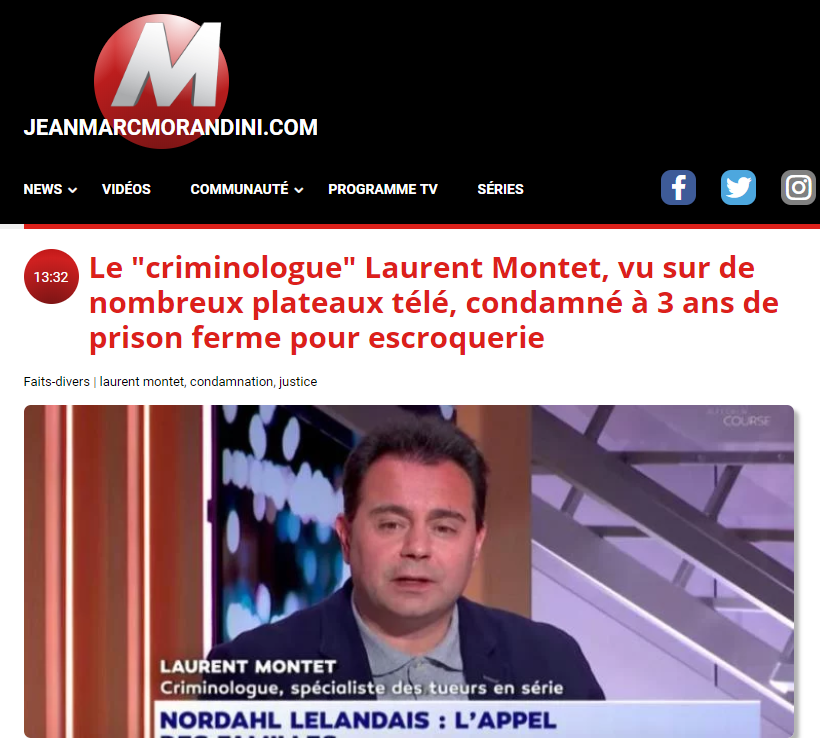 Jean-Marc Morandini ricane sur son blog, jeudi 28 février, en relayant une information du Parisien. Laurent Montet, "criminologue" "très régulièrement invité des plateaux télévision", dixit le Morandini blog, vient d'être condamné à 3 ans de prison ferme et 20 000 euros d'amende par le tribunal correctionnel de Troyes (Aube).