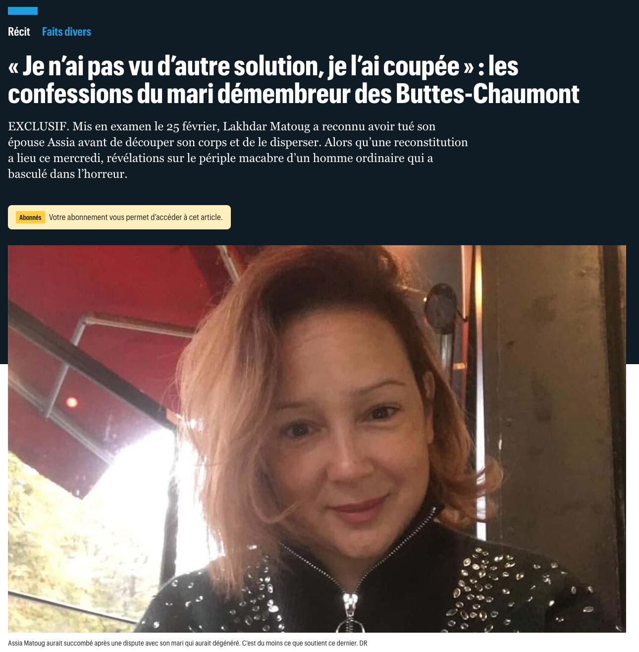"«Je n'ai pas vu d'autre solution, je l'ai coupée» : les confessions du mari démembreur des Buttes-Chaumont". Il ne s'agit pas ici d'une parodie de film d'horreur, mais du titre d'un article du Parisien, publié lundi 3 avril. L'affaire en question est celle du féminicide d'Assia Matoug, dont le corps mutilé a été retrouvé mi-février dans une benne du parc parisien des Buttes-Chaumont et dont le mari, Lakhdar (ou, de son surnom "Youcef") Matoug, a reconnu être l'auteur.
