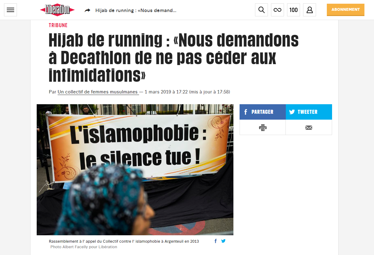 encore une fois qui publiait deux tribunes aux antipodes l'une de l’autre. D'abord celle d’un "collectif de femmes musulmanes" qui, le 1er mars dernier, après la polémique éphémère mais non moins virulente autour du hijab de running, témoignent des discriminations qu’elles subissent en tant que femmes musulmanes. "Nous, femmes musulmanes, subissons une islamophobie quotidienne, et le renoncement de Décathlon à commercialiser le hijab de running illustre une nouvelle défaite de la tolérance dans la société française", écrivent-elles.